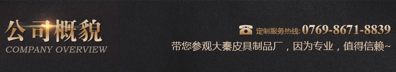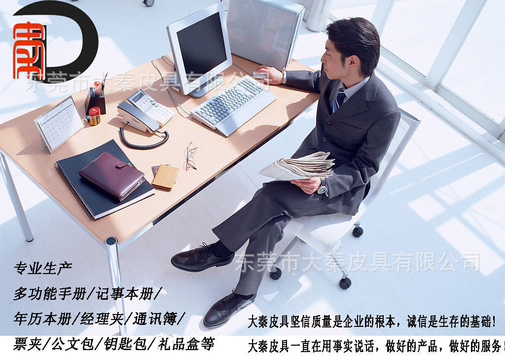 东莞市大秦皮具有限公司是一家集开发,设计,生产和贸易于一体的专业皮具公司。公司保有优异的技术和经验丰富的管理人员,享有200多名职工。该公司主要生产和加工各种皮革,人造革和织物。manuals/记事本册/年历本册/经理夹/通讯簿/票夹/公文包/钥匙包/file袋以及其他文化教育产品和商务皮革产品,我们公司秉承“诚信为本”的规范,提供高质量的产品和有着竞争力的价钱。竭诚欢迎国内外客户来电来信洽商业务。共创美好的明天。