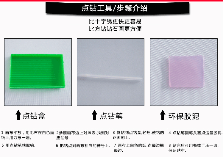 十字绣绣花需要一针一针,而钻石画则需要将钻石胶合到画布上的相应色点。