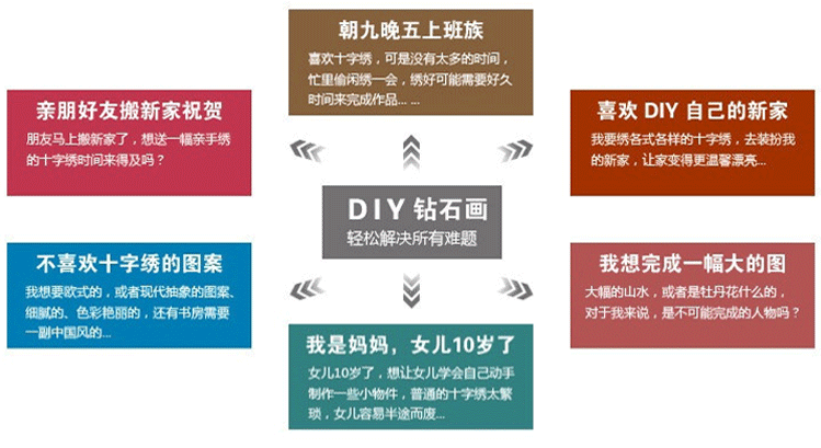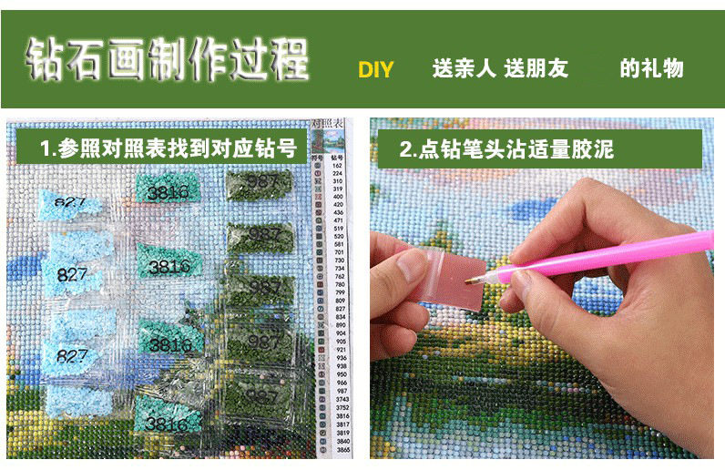 钻石画是十字绣之后的新秀。它具相同的diy精神上,工艺更为健全和精巧。十字绣更针对女性消费群体或观众;diy钻石画针对男性,女性和儿童。对于女性,十字绣从针开始。