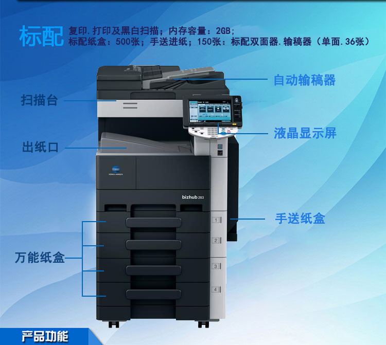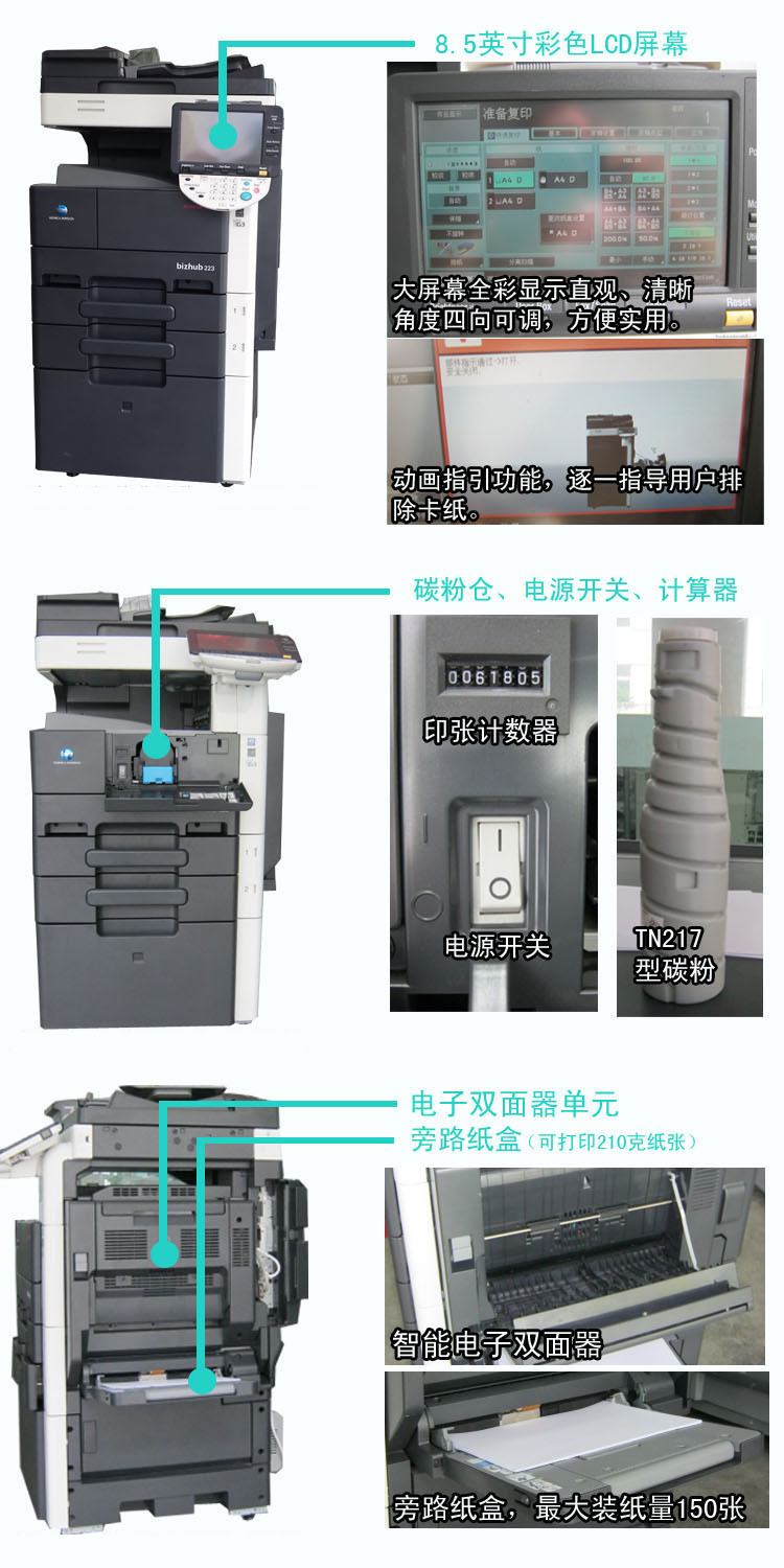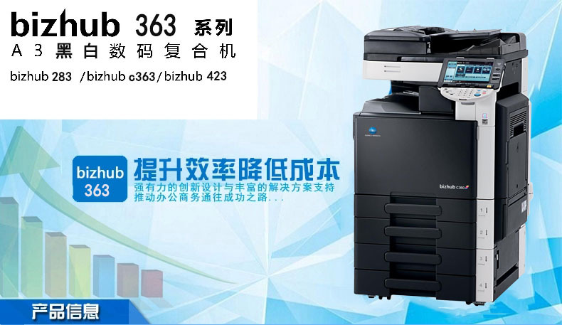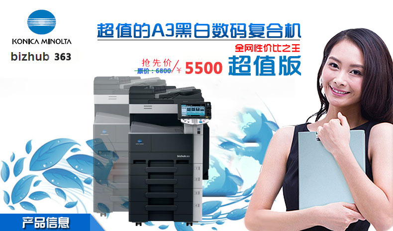 产品详情:柯美BH363是2014年复印机市场上最受追捧的中速黑白复印机。此型号延续了BH350,BH250原始硬件的稳定性,并且早就对软件开展了全盘升级系统,非常好处置大量文件,大规模打印任务。BH363可以看做是黑白机器和彩色机器的混合体。显影组件的空隙轴已获得改进。新的363机器全然化解了显影漏载体的缺陷,并延长了成像单元的使用寿命。经典的色彩机用以固定。c353的固定构造可保证均匀加热和安定温度。一个划时代的模型的诞生,影响了二手租赁市场,美妙的集成,精巧的设计,并盼望顾客检查。