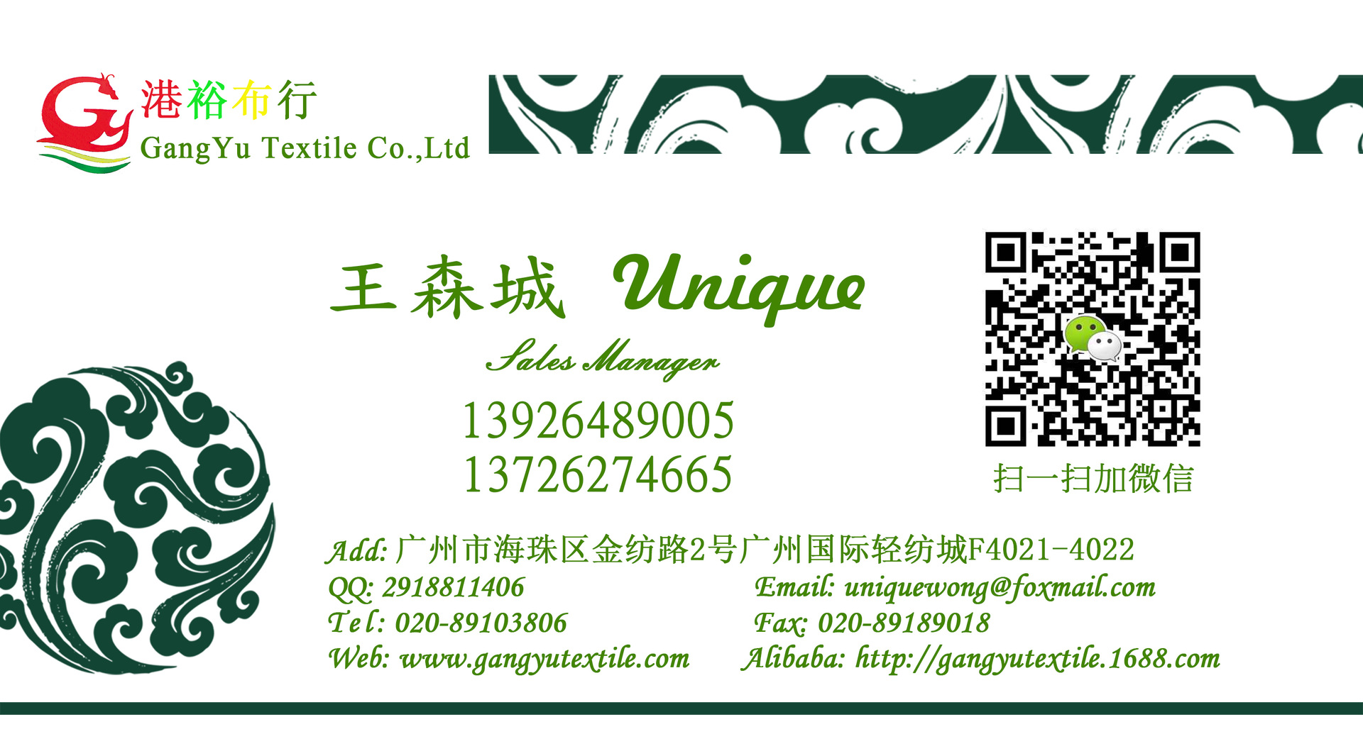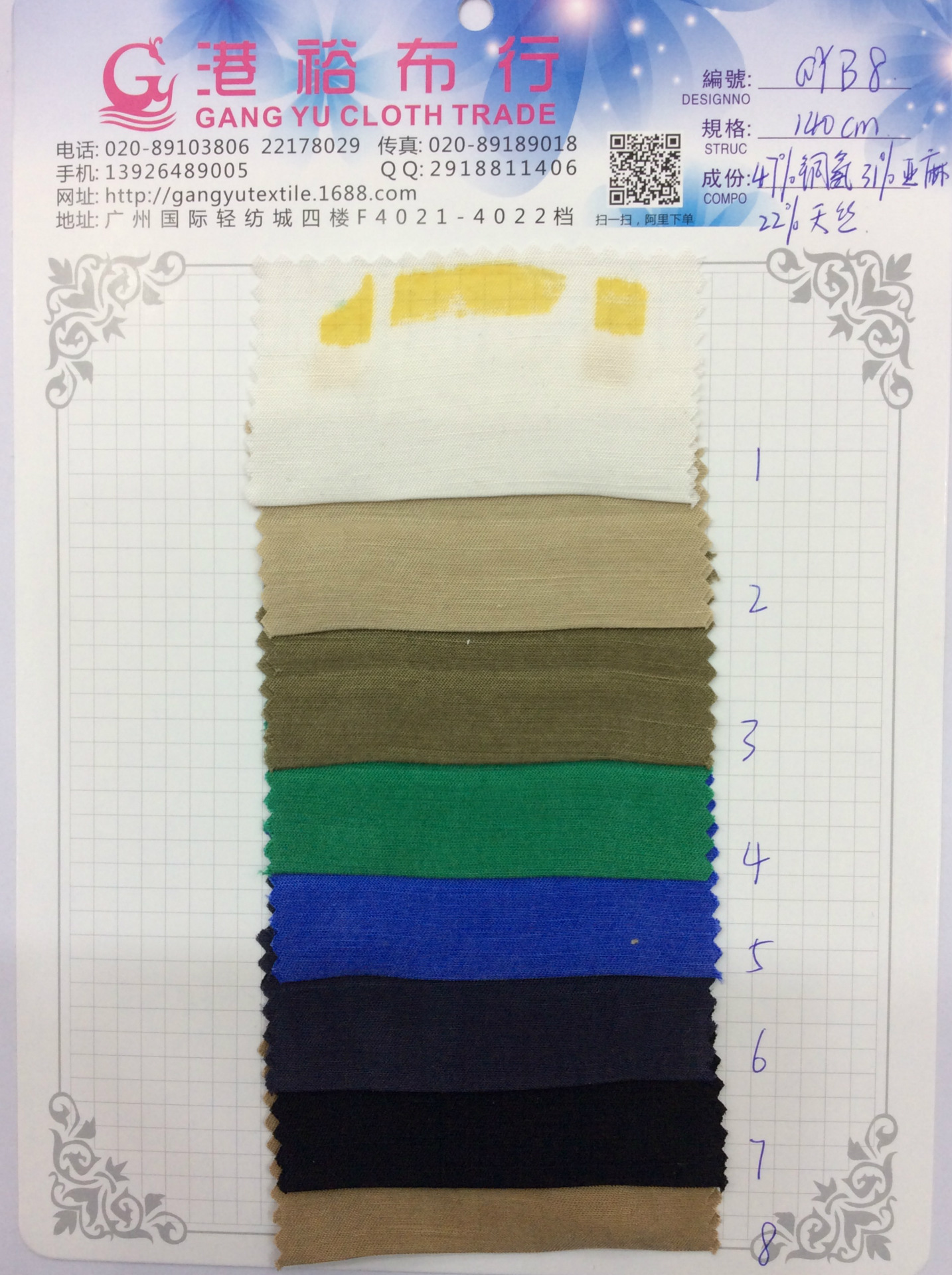 产品详情:广州港裕布行成立于1992年。它是一家集生产,加工和贸易为一体的现代化大型纺织企业。几年来,公司坚称“以人为本”的学说,坚称产品创新,质量保证,诚信经营,稳步发展的经营思维,产品一直维持着强劲的市场竞争力。