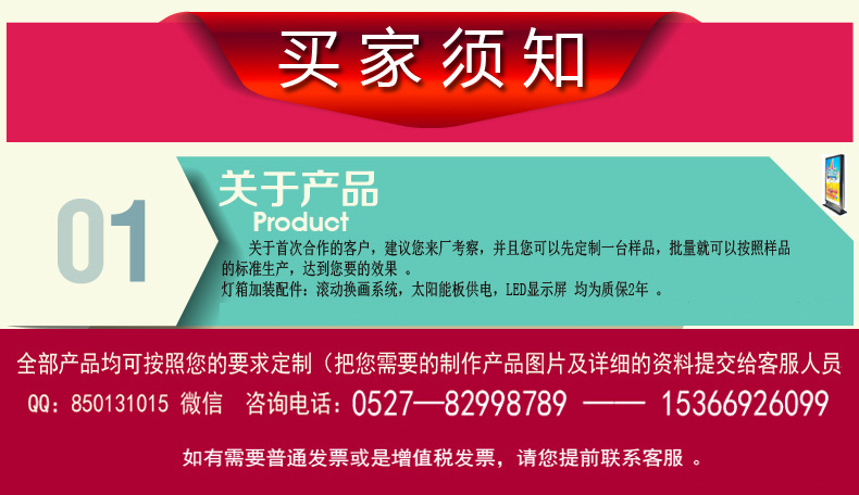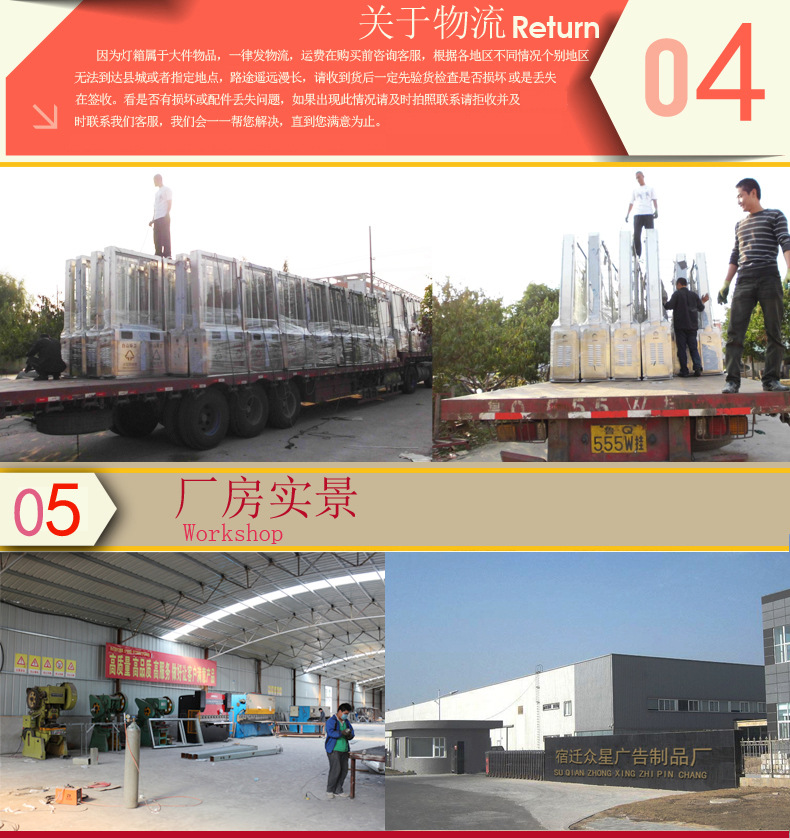产品详情:众星广告制品厂是一家专门从事广告制作,生产和销售的公司。我们公司的主要产品包括:停车场,太阳能广告垃圾桶灯箱,滚动广告灯箱,废旧衣裳回收箱,阅报栏灯箱,大型候车亭灯箱,路标灯箱,自动柜员机防护罩,保安岗亭房。产品是独立自主设计,加工和制造的,以“质量第一,服务至上”的规范为客户提供优质的产品和健全的服务。