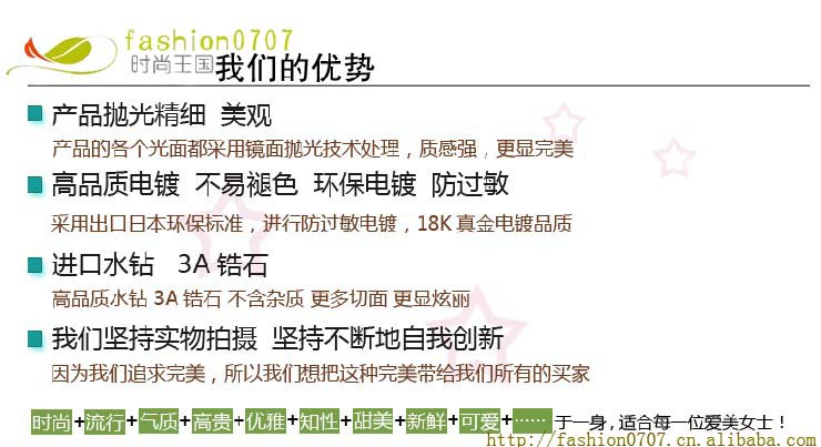 本厂主要生产:手机合金配件,发饰,胸针,水晶饰品,韩国饰品,钥匙扣,胸针,水晶胸针,头饰,饰品配件等。库存产品赞同小额批发,数目更大,功效更好价钱!对于实体批发商,在线购物商场等,根据官方网站上的热点产品图片或进口原始产品,展开多次质量检查,中高端质量平稳,并且大量现货批发。引进装置,专注于“保色电镀”产品,接纳定制的图纸和样品,并奋斗为新老客户创造价位更低的更多高质量产品。