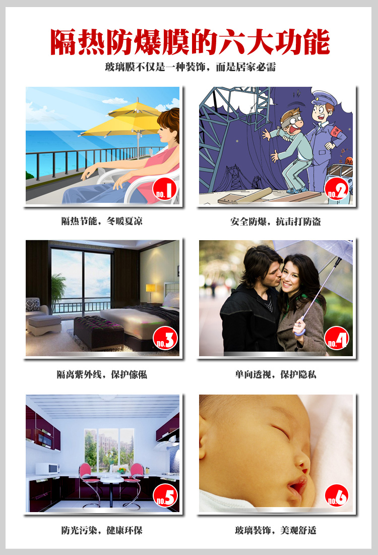透光率越高,屋子越亮;红外光会产生热效应,因此红外隔热率越高,隔热效用越好;紫外线对人体和家具危害,因此紫外线阻断率越高越好。