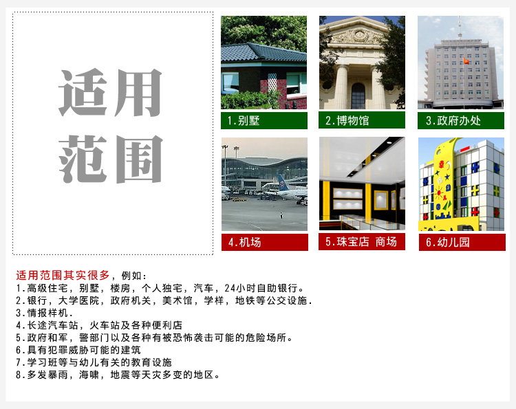 适用于房舍,商贸办公楼,旅馆,工厂,各种日光浴室和天窗等建筑物。
