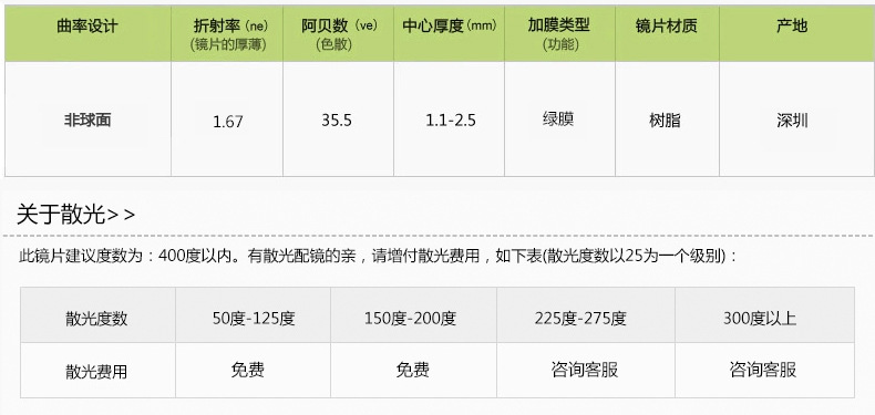 提示:阿里巴巴上面的选择较少,因为阿里巴巴限制了20个发光度,如果您需其他发光度,请关系我们的客服人员,我们将向您发送订购单,或直接向我们发送旺旺您想要的度数以上,我们将根据您的订单发送。确实的实力是认证公司,而不是批发机构或自雇人士。我们公司讲实情。这副镜片是1.67的非球面绿色薄膜,每副只有35元,在市场上我们每副卖50元,亲爱的,您还在等什么,快点!我们的镜片绝不脱落,我们会付给您100对如果我们向公司定购任何镜片,我们可能会损失1到100。