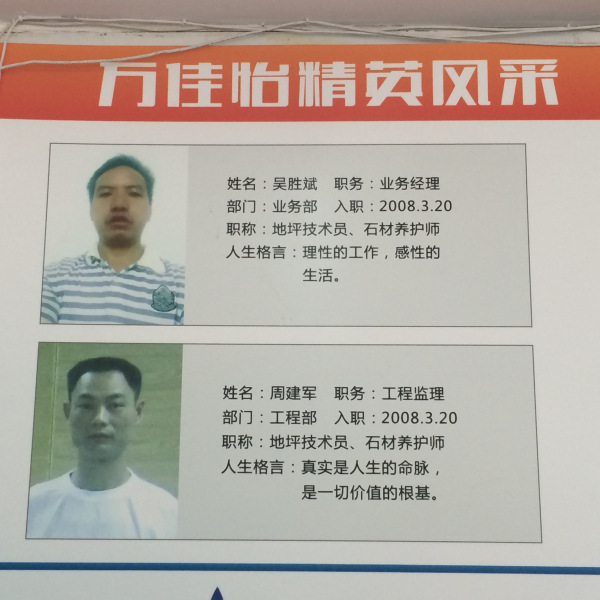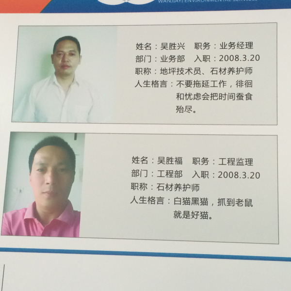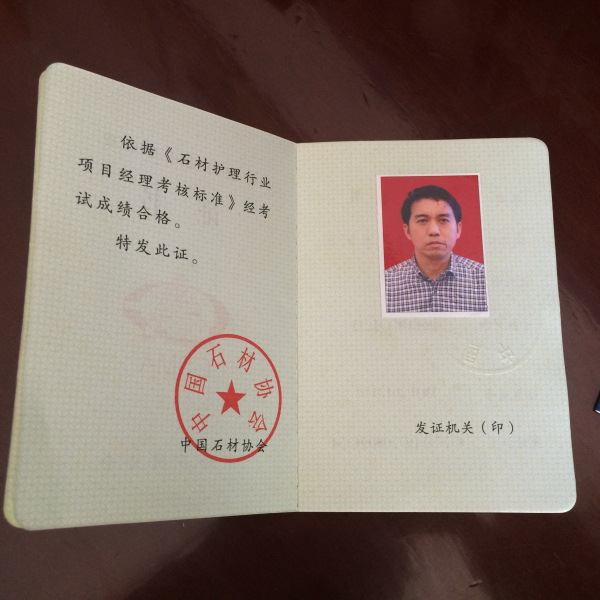 公司享有国家颁发的“石材养护工程师”,“石材养护工友”和“石材干净养护施工甲级”资质证书。保有完整科学的质量管理体系。与国内外众多地板施工相关单位和企业确立合作关系。