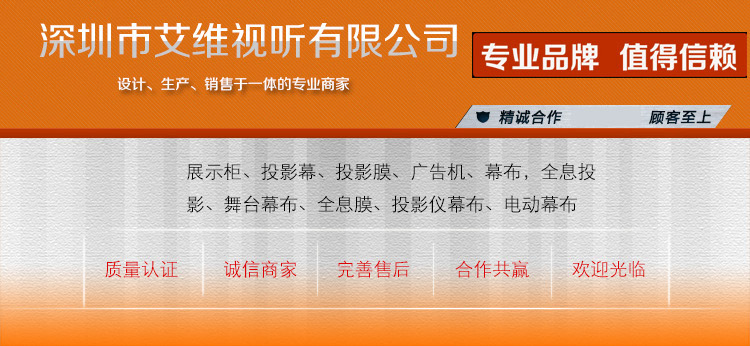 深圳市艾维视听有限公司主要经营全息玻璃屏风,全息展柜。3D全息展柜广告机,迅速折叠屏风,投影屏,透声幕布,背投屏风,镜框屏风等产品。一家专业生产和加工产品的民营企业,以诚信,实力和产品质量得到行业认可。欢迎各界朋友光临公司,指导接洽业务。