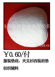 产品详情:有多种款式的肩垫,男女款式,幼儿款,西装式肩垫,夹克式肩垫等。一些常规款式有现货,也可以定制。质量好,不变形。原料主要是聚酯。价钱是不同的。我们在营业部生产针刺棉,PP无纺布,水刺无纺布,易熔衬,肩垫,绣花衬,低领以及各种服装标贴,毛毡,EVAfoam常熟新丰辅料市场6078号,黄胜利先生,13901572759,0512--52995977