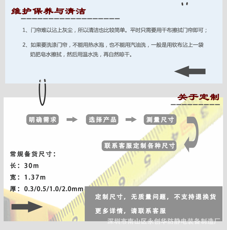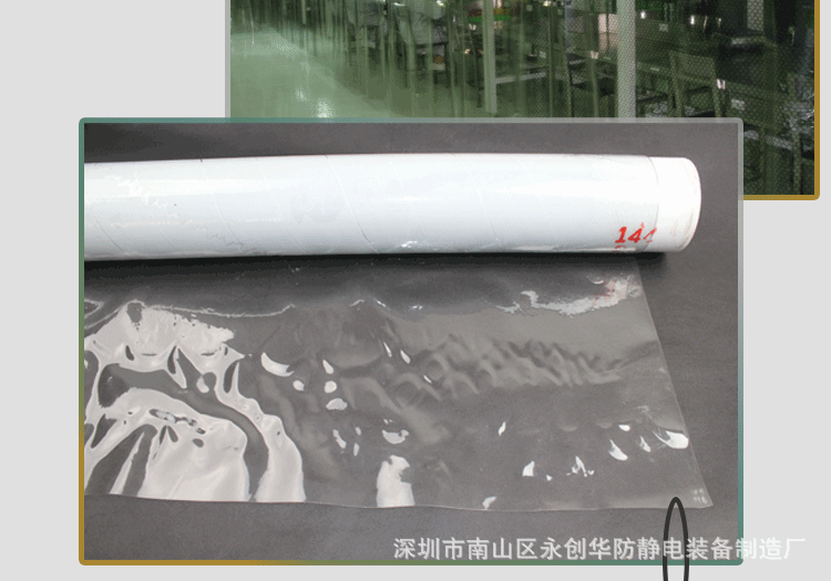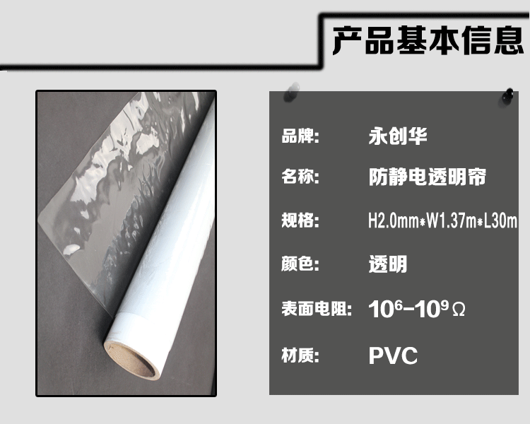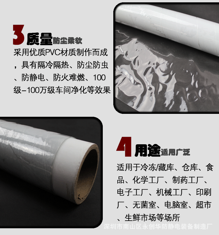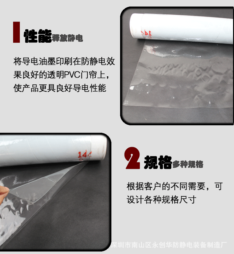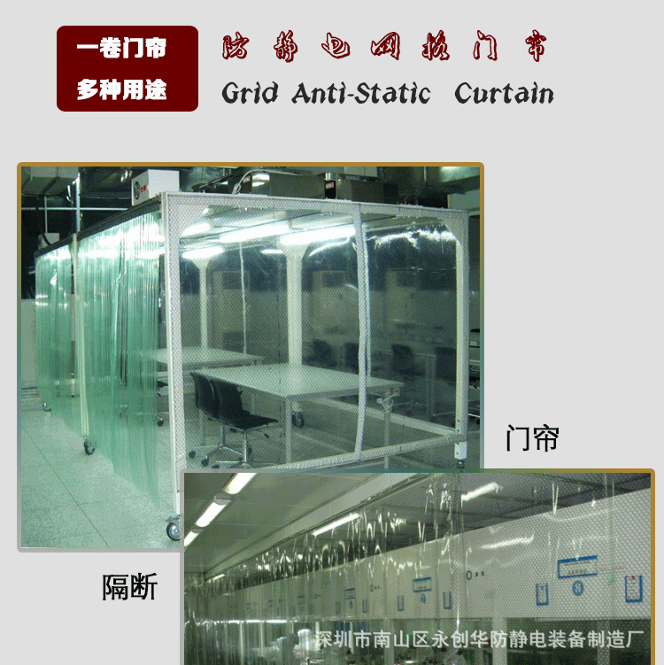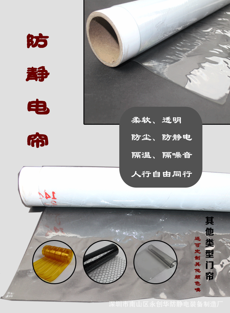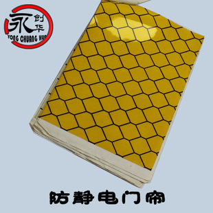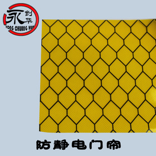 防静电门帘柔软,透明,防尘,防静电,对行人免费。它们普遍用以电子工厂,钟表,食品,制药,制冷和其他行业。它们特别合适电子行业中的净化车间和无尘车间。,黑色导电油墨以不错的抗静电功效印刷在PVC薄膜上,从而使产品网格有着不错的导电性。