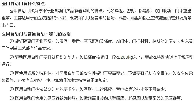 医用自动门是专为化工环境的进出而设计的自动门,对干净和密封性有很高的要求,其开合稳定,方便,安全准确,可以满足气密,隔音的特殊要求绝缘和智能。