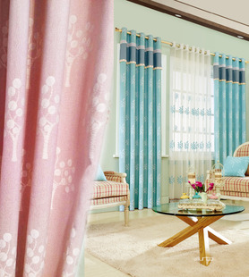 粉蓝绿色灰色富贵摇钱树卧室客厅纯棉亚麻提花遮光成品窗帘布直销