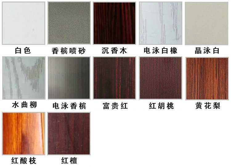 [材质]:彩色铝合金:白橡木,金橡木,红酸枝木,水曲柳,陈檀香,电泳香槟等。
