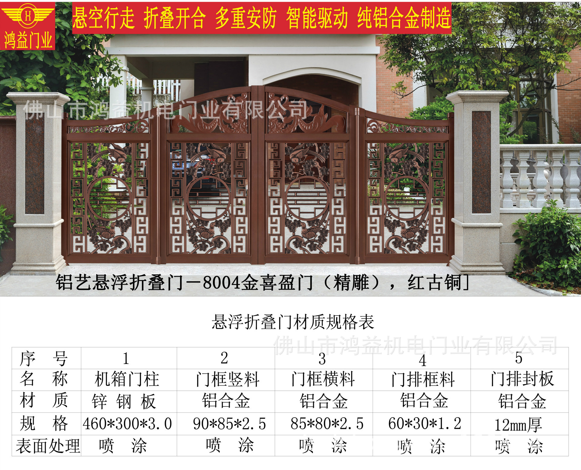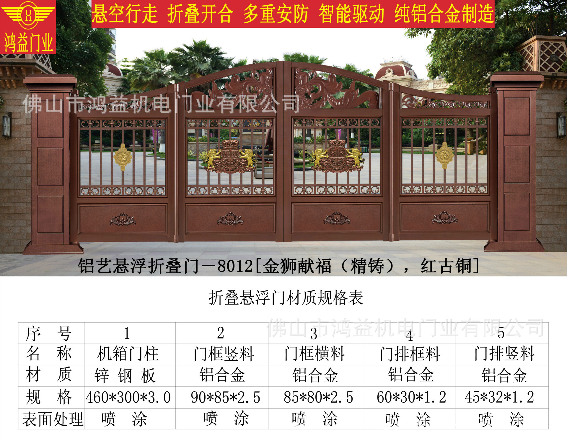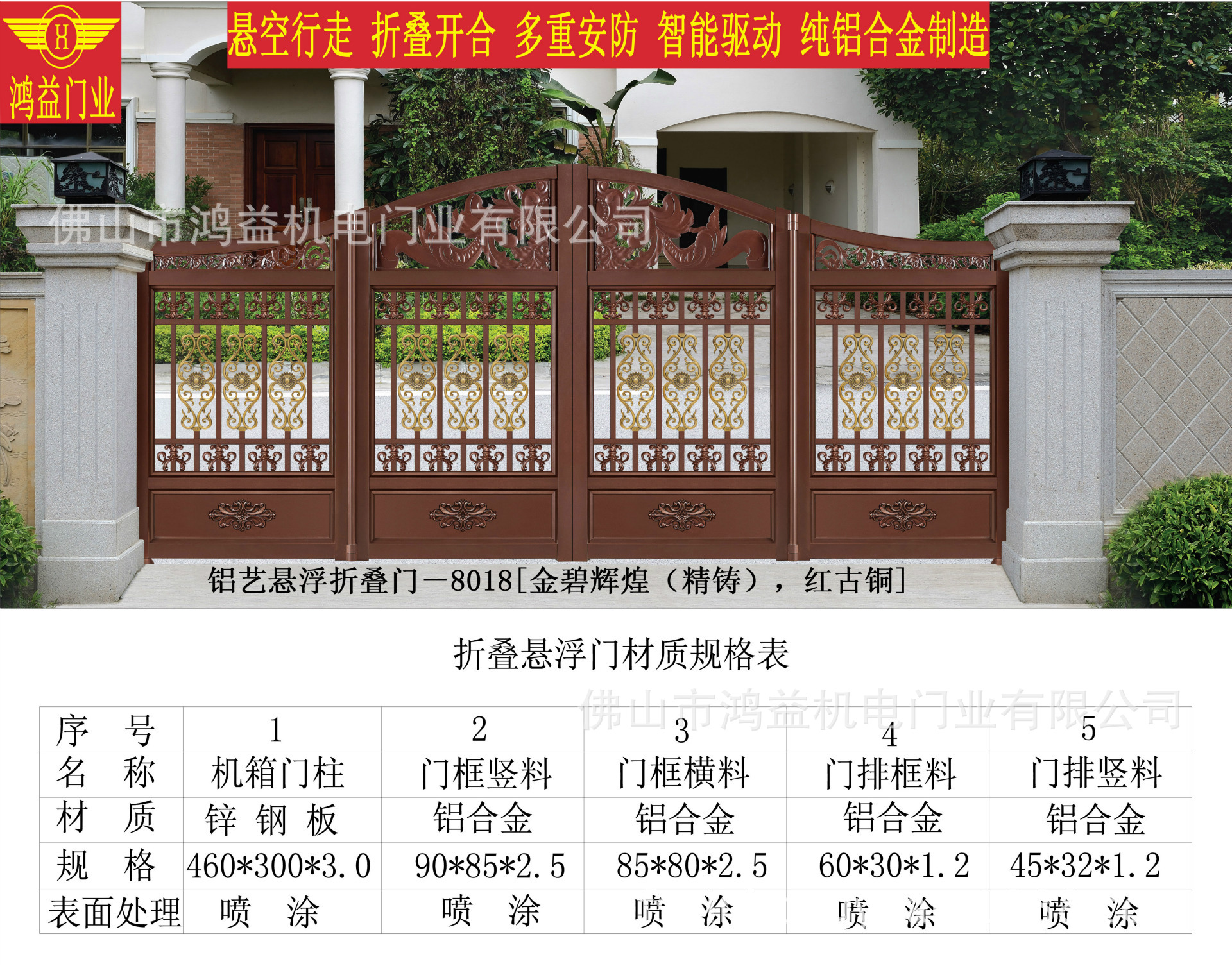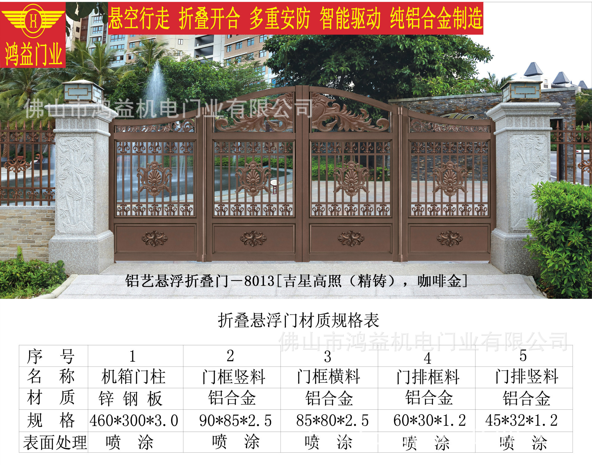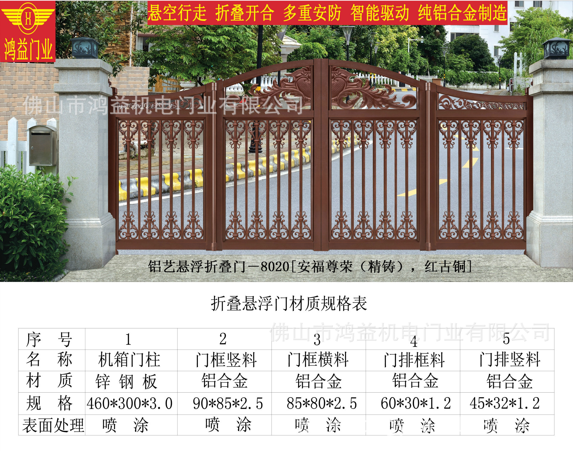 崇敬的客户:您好。我们公司在线销售多种产品型号,产品不停更新,可以根据客户要求展开定制。网站上显示的产品价钱仅供参考,愿意客户会知道。对于特定价钱,请通过电话或在线关系我们公司开展详尽咨询和谈判。我们将竭诚为您服务。鸿益机电门业智能铝艺折叠式别墅门诞生了,掀起了行业变革。世界上第一个独家专利技术,智能铝艺浮动式折叠门是鸿益机电门业公司一个震世的作,立刻获取了成功。产品一经推出便赢得了市场的赞誉和普遍认可。该产品的技术含量和性能优势是其他门产品所无法比拟的;