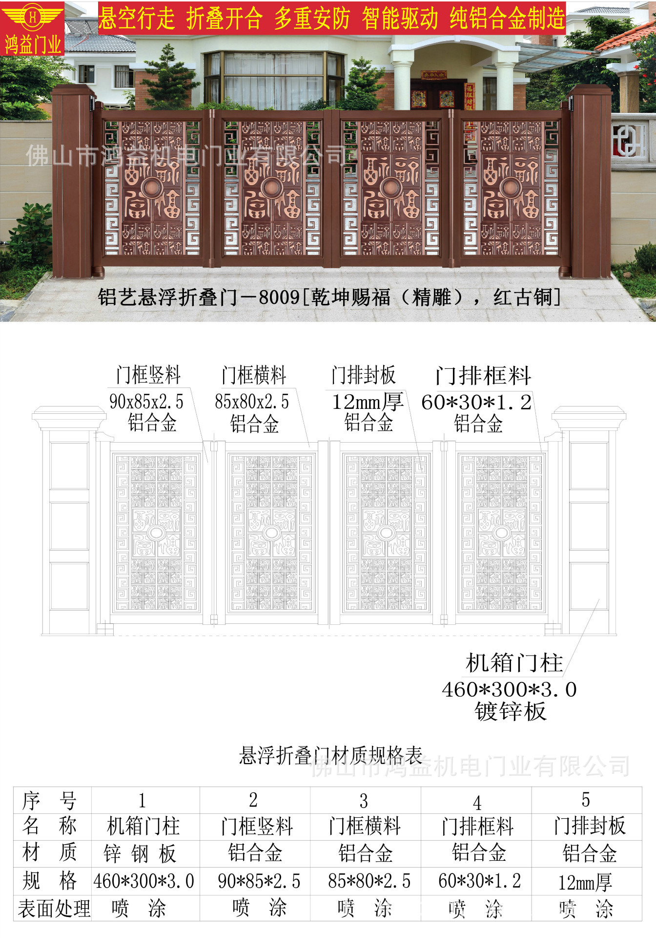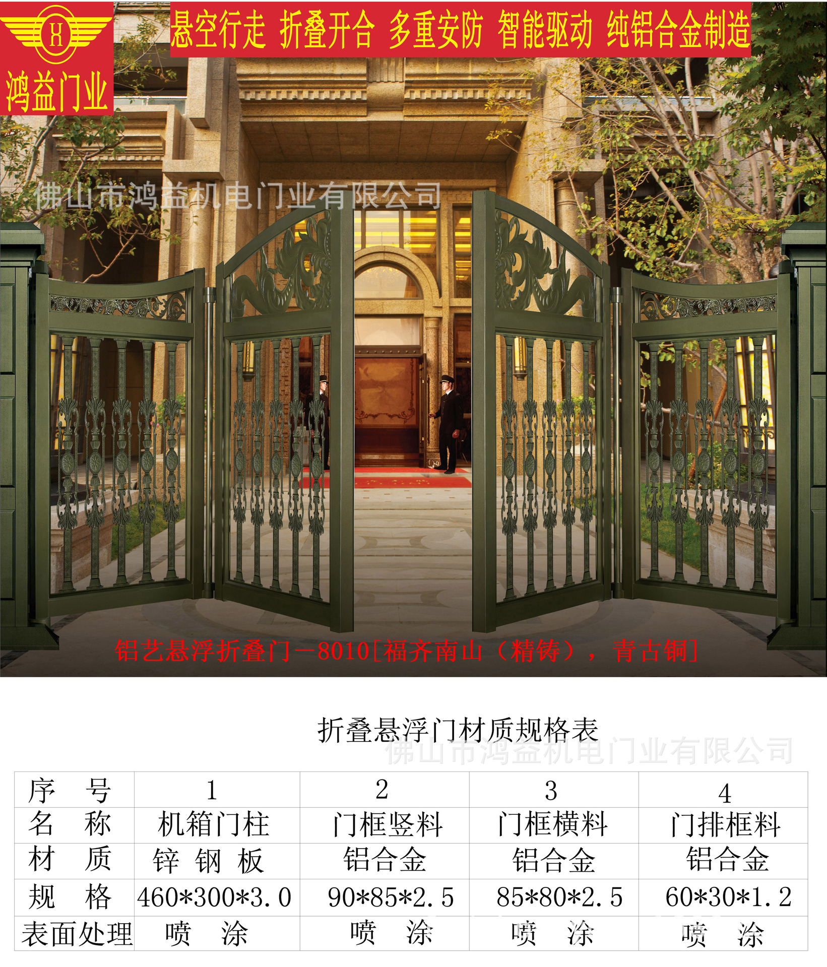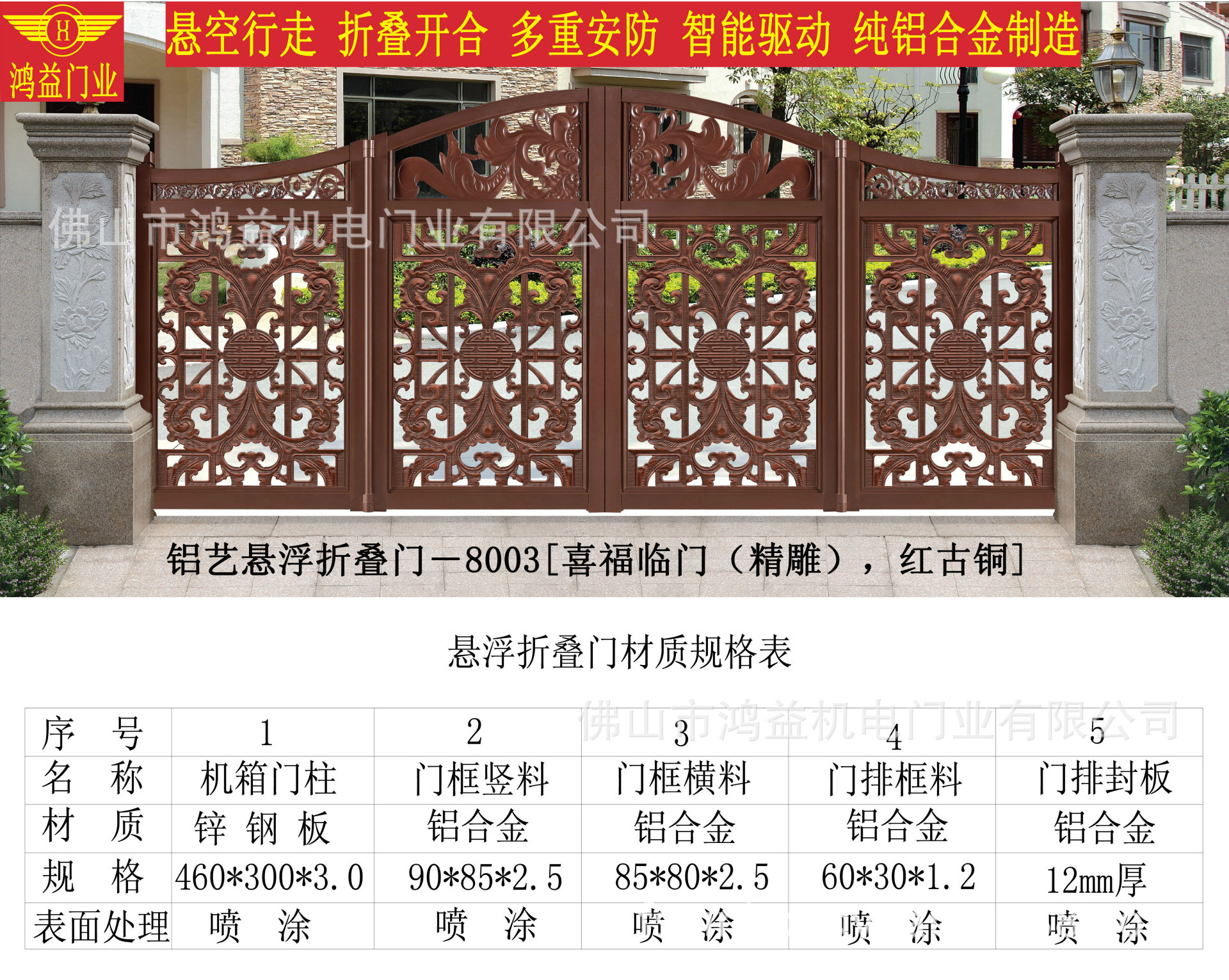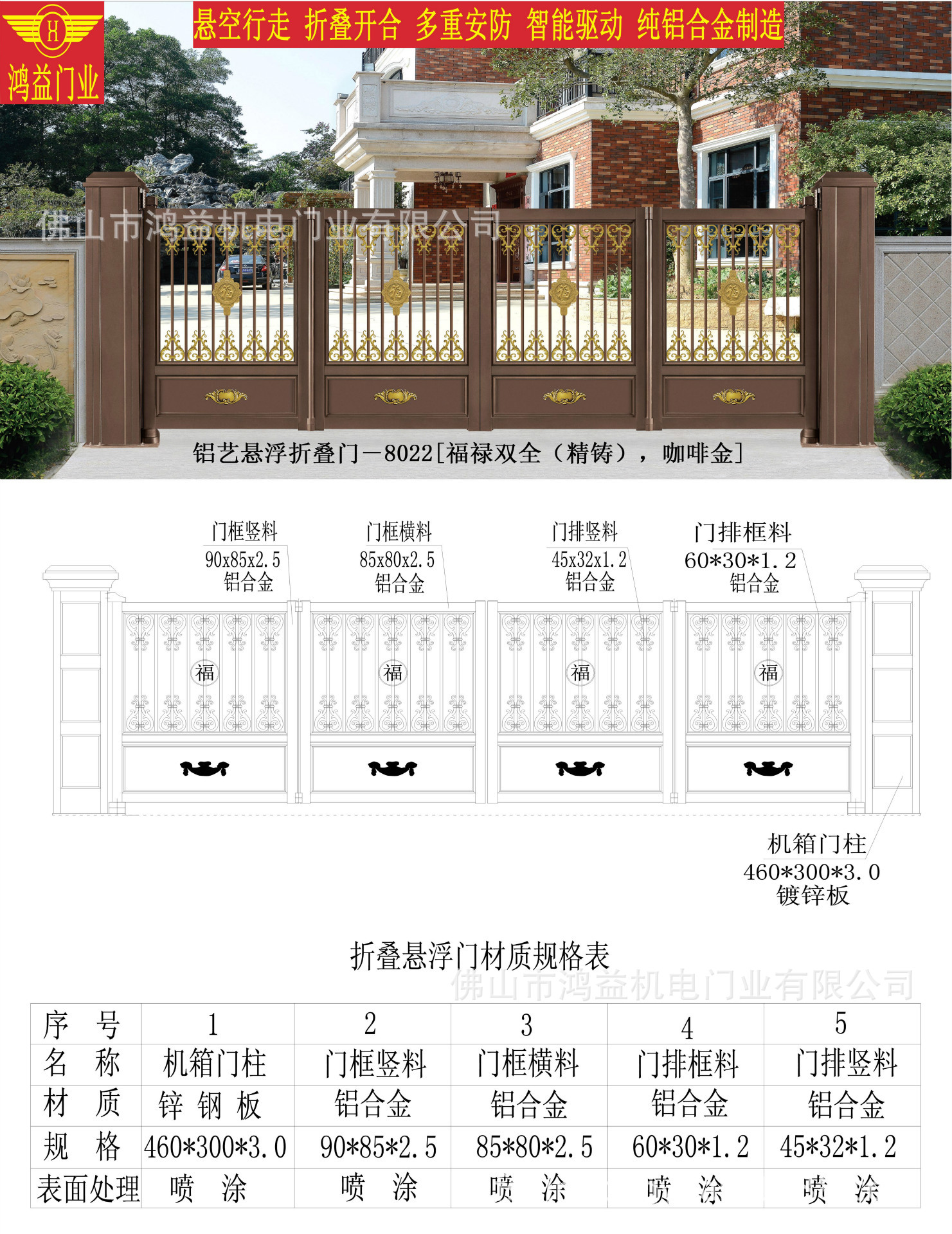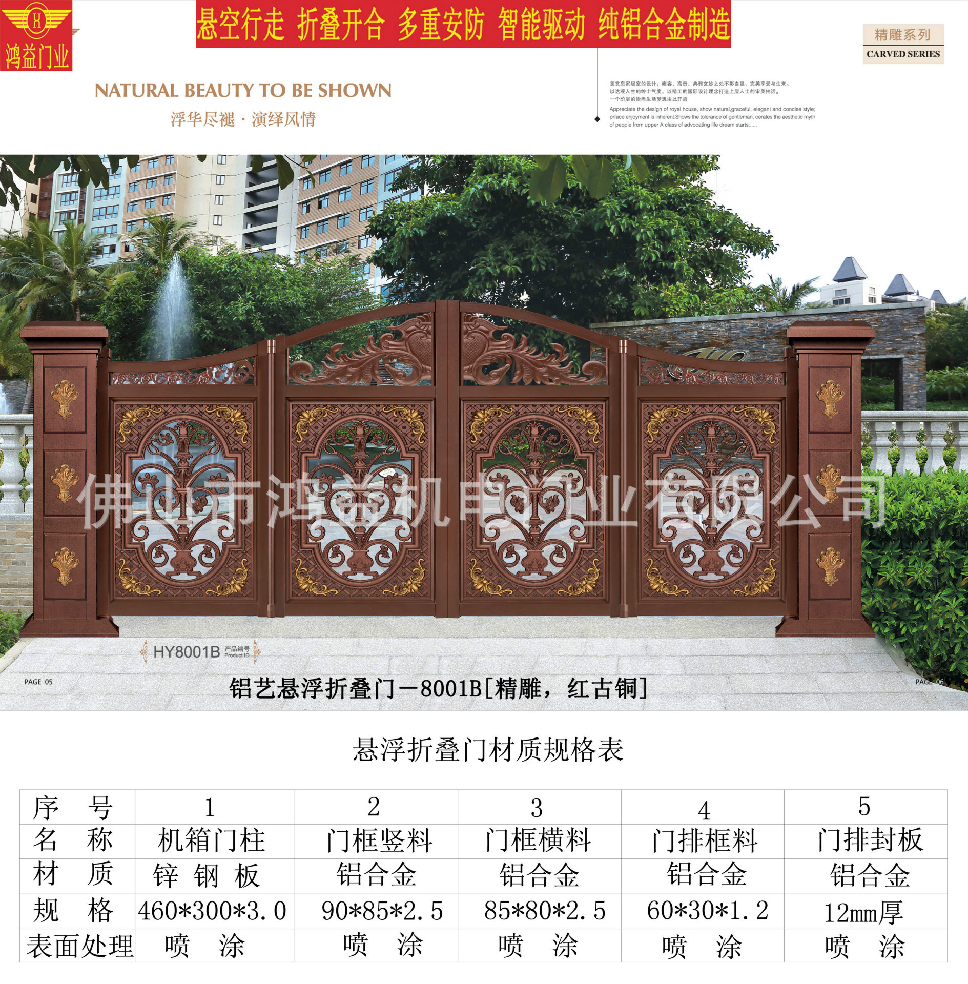 崇敬的客户:您好。我们公司在线销售多种产品型号,产品不停更新,可以根据客户要求展开定制。网站上显示的产品价钱仅供参考,愿意客户会知道。对于特定价钱,请通过电话或在线关系我们公司开展详尽咨询和谈判。我们将竭诚为您服务。鸿益机电门业智能铝艺折叠式别墅门诞生了,掀起了行业变革。世界上第一个独家专利技术,智能铝艺浮动式折叠门是鸿益机电门业公司一个震世的作,立刻获取了成功。产品一经推出便赢得了市场的赞誉和普遍认可。该产品的技术含量和性能优势是其他门产品所无法比拟的;