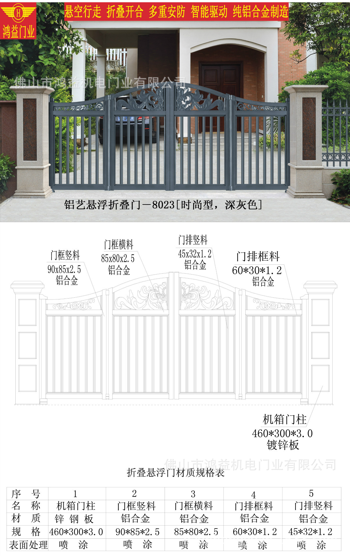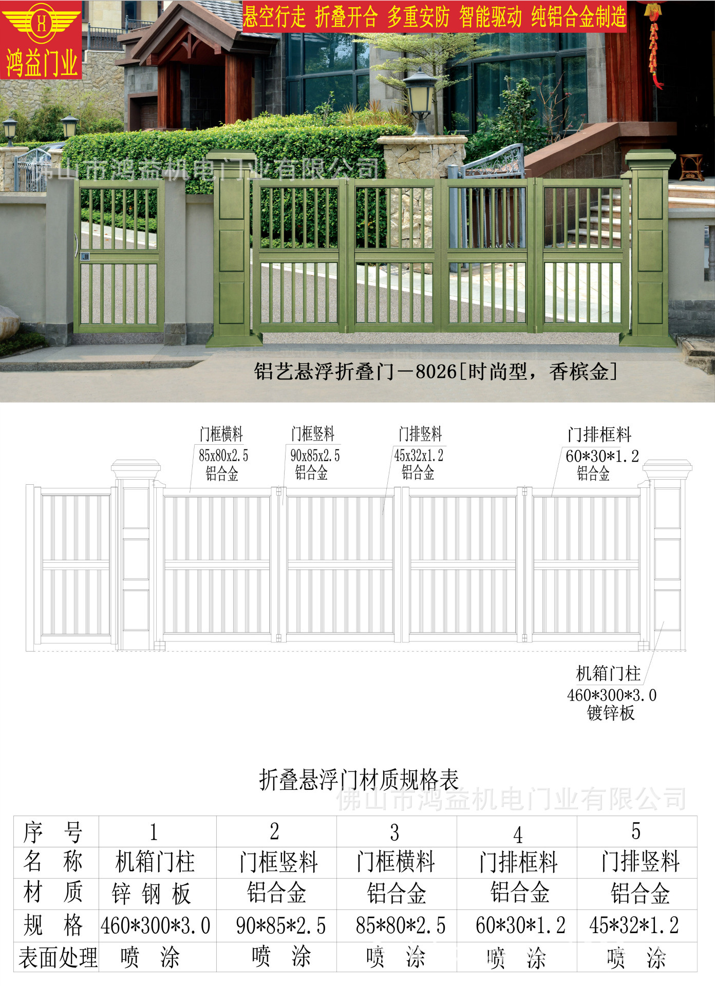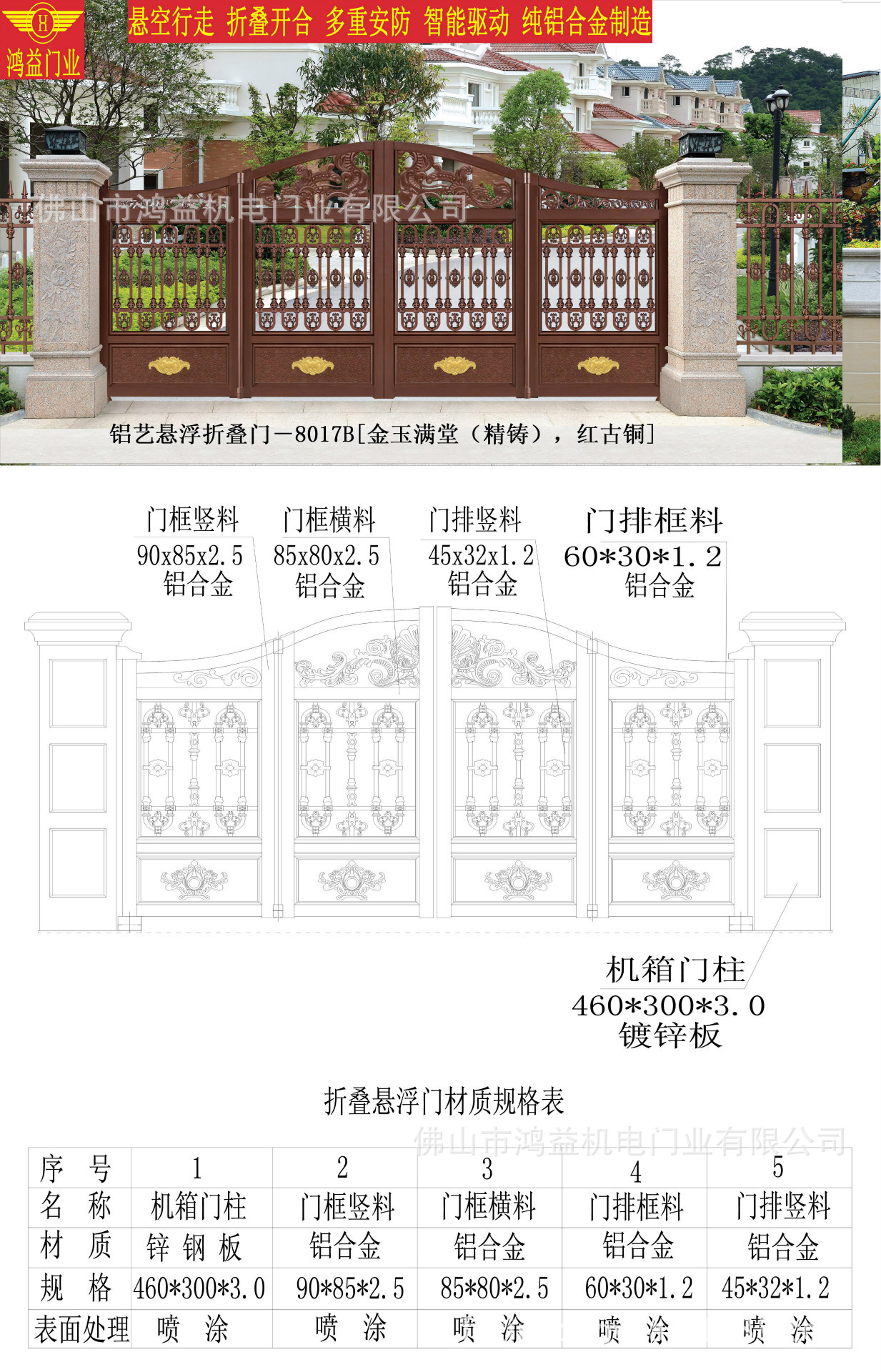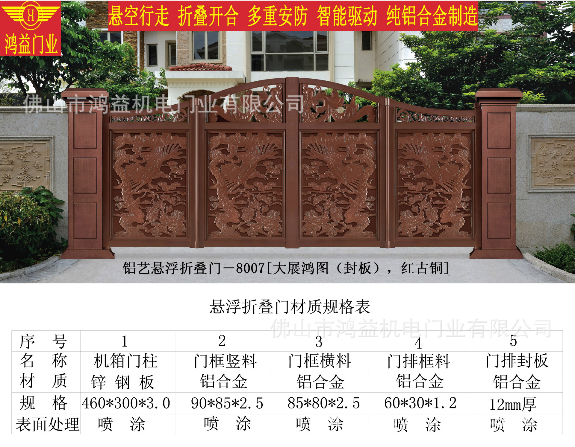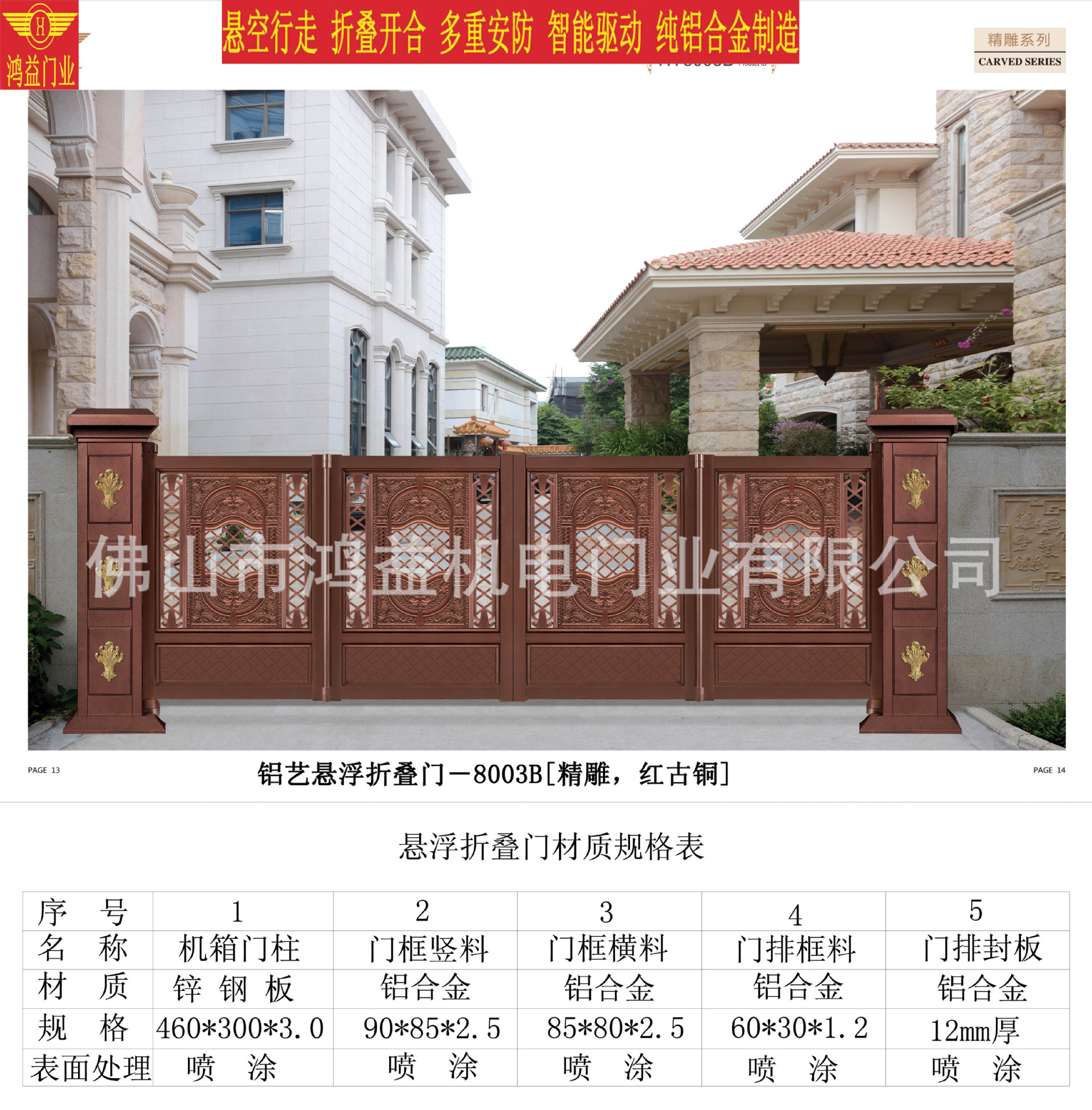 崇敬的客户:您好。我们公司在线销售多种产品型号,产品不停更新,可以根据客户要求展开定制。网站上显示的产品价钱仅供参考,愿意客户会知道。对于特定价钱,请通过电话或在线关系我们公司开展详尽咨询和谈判。我们将竭诚为您服务。鸿益机电门业智能铝艺折叠式别墅门诞生了,掀起了行业变革。世界上第一个独家专利技术,智能铝艺浮动式折叠门是鸿益机电门业公司一个震世的作,立刻获取了成功。产品一经推出便赢得了市场的赞誉和普遍认可。该产品的技术含量和性能优势是其他门产品所无法比拟的;