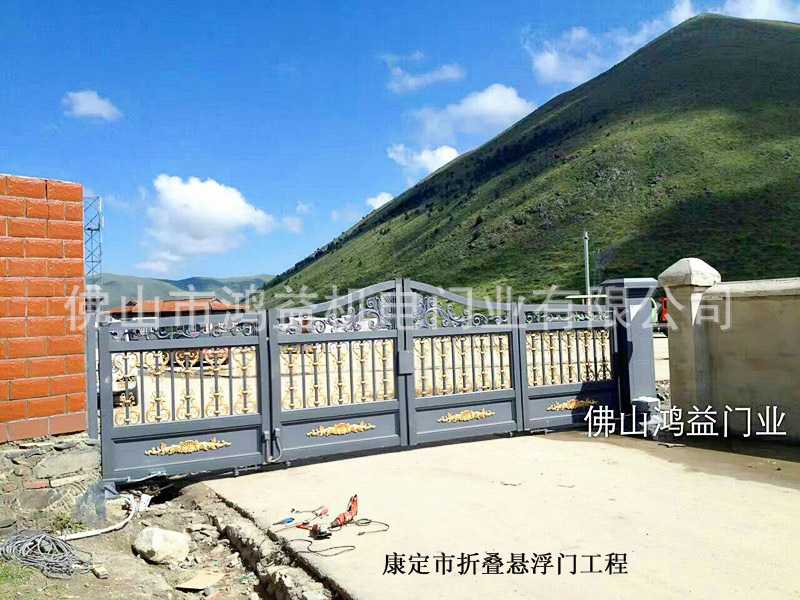 鸿义折叠式别墅门:门体悬挂后可行走,不受门路条件的限制(如:铁路,冰雪积雪,地下电缆,斜坡等)。轨道,道路上没有事先嵌入的轨道,也没有毁坏道路。