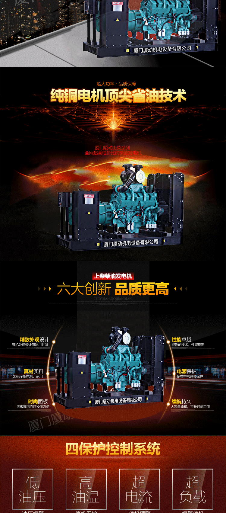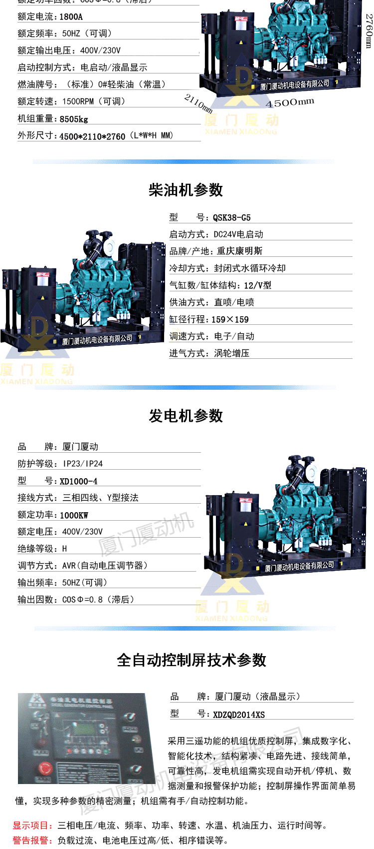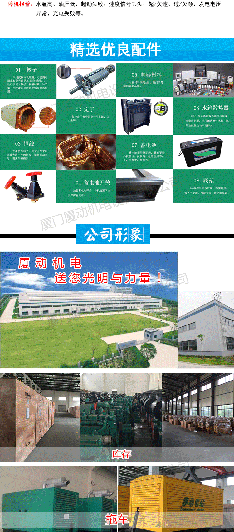 厦动发电机组产品主要包括:奔驰系列(MTU),康明斯系列(CCEC,DCEC),珀金斯系列(Perkins)三菱系列,大宇系列,沃尔沃series(VOLVO),道依茨series(DEUTZ),上柴series,济柴series,潍柴series,玉柴series,固定系列等;规格从3kw到2000kw;机能包括一般而言种类,自启动,低噪音,移动,多机并行,远程控制等。