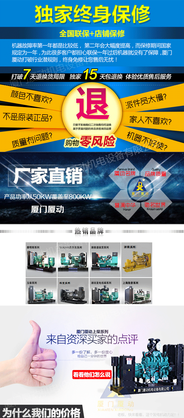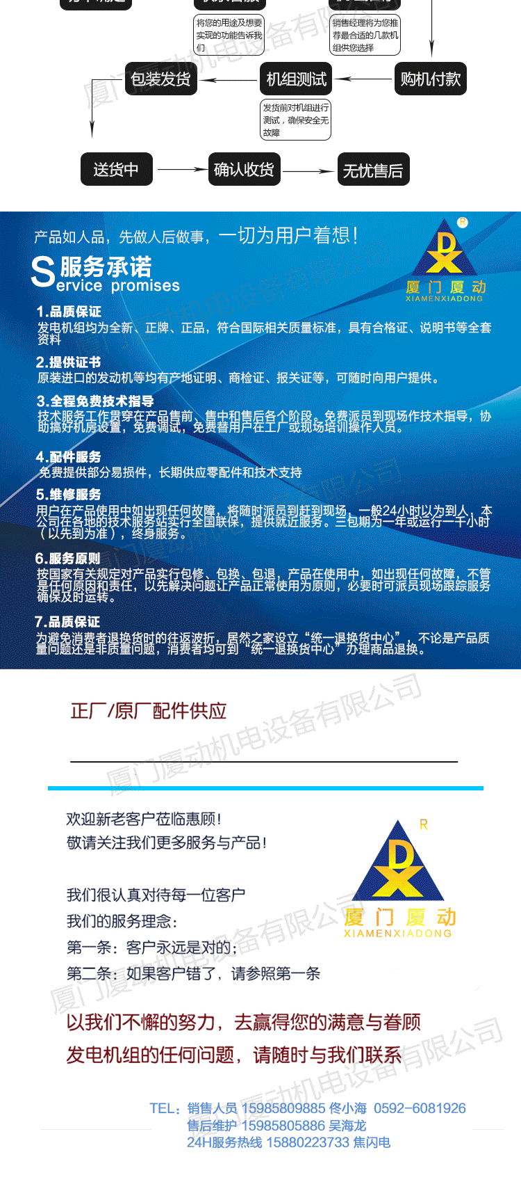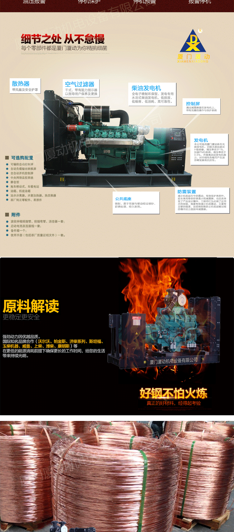厦动发电机组产品主要包括:奔驰系列(MTU),康明斯系列(CCEC,DCEC),珀金斯系列(Perkins)三菱系列,大宇系列,沃尔沃series(VOLVO),道依茨series(DEUTZ),上柴series,济柴series,潍柴series,玉柴series,固定系列等;规格从3kw到2000kw;机能包括一般而言种类,自启动,低噪音,移动,多机并行,远程控制等。