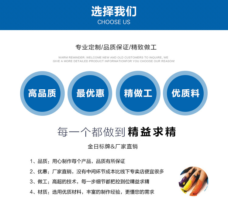 苍南县金日标牌厂是一家集设计,开发,生产,销售为一体的企业。公司完整的质量管理体系和高素质的员工队伍,确保了公司的身心健康发展。经过公司全体员工的不懈奋斗和发展,取得了新老客户的好评和信赖。