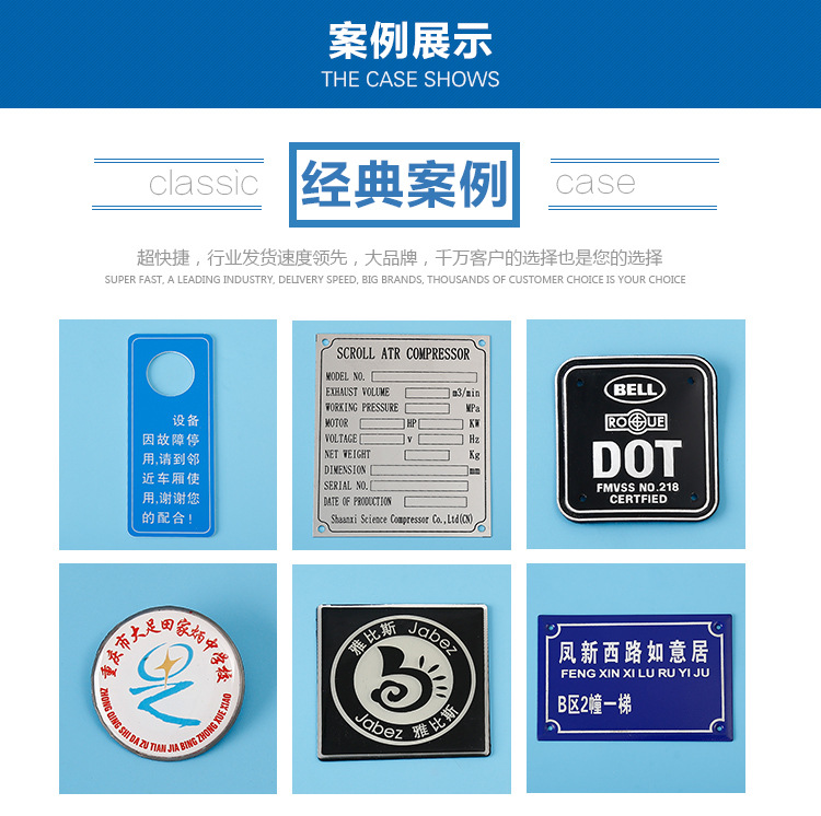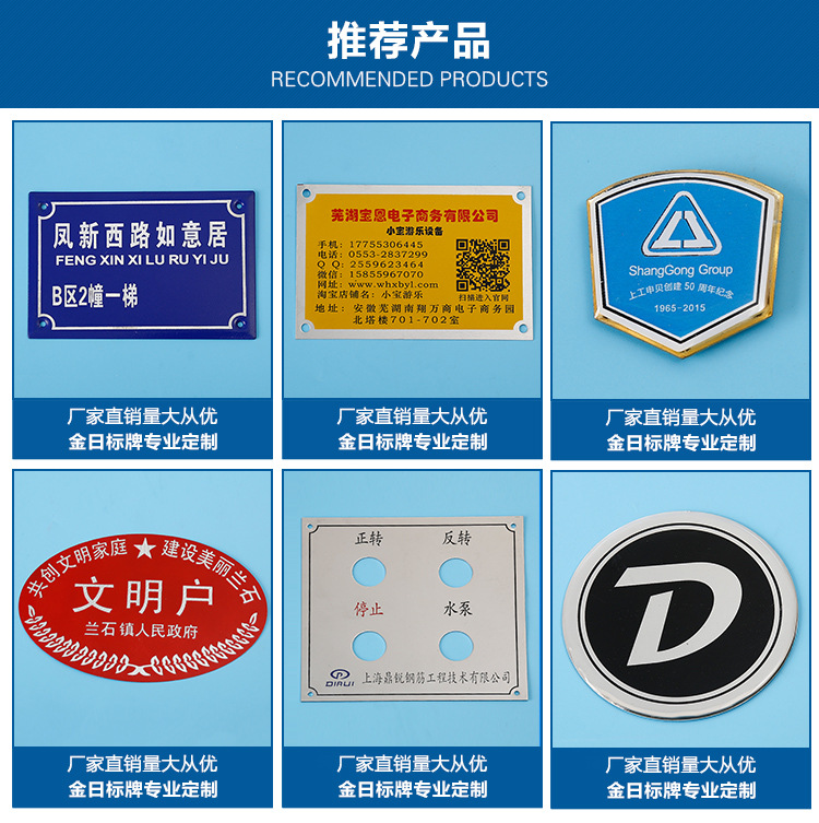 苍南县金日标牌厂专业生产奖牌,铝板,房屋板,徽章,商标,铜牌,水晶板,浮雕板,不锈钢板,搪瓷牌,小夜灯,交通标志,办公室门板,激光商标,三维软标等产品,公司秉承“客户至上,诚信至上”的规范,不停为客户提供增值广告和促销产品服务,与多家公司成立了长期合作关系,并且随着客户的增长而增长。高起点,高品质,高声誉是我们永恒的追求。生产一流的产品和提供一流的服务是我们的永久承诺。愿我们联合创造辉煌。