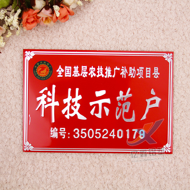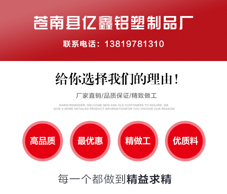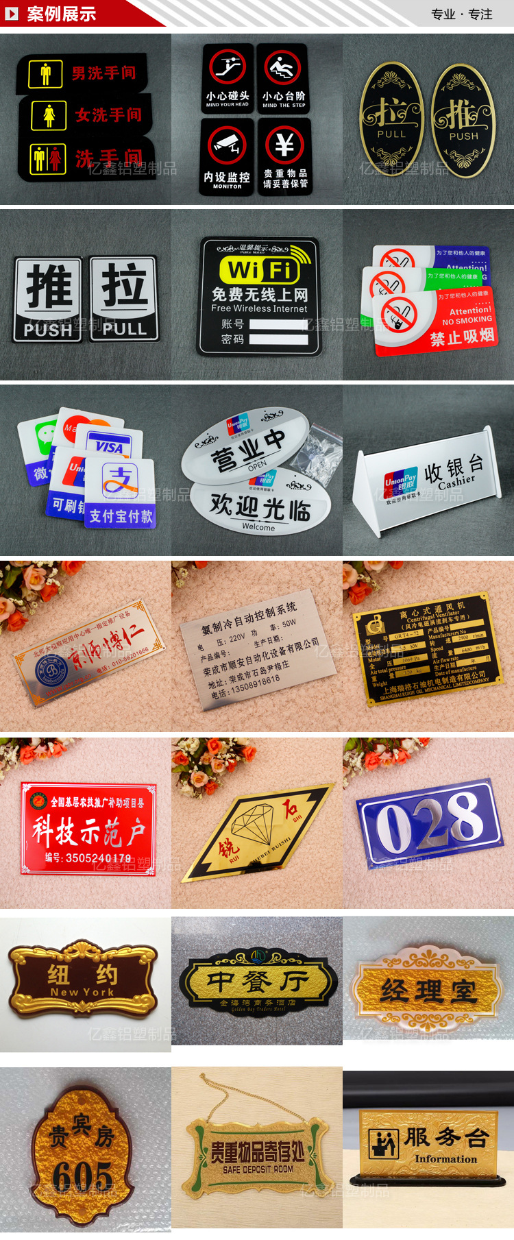 苍南县亿鑫铝塑制品厂是一家专业设计和生产公共场所如酒店,旅店,政府机构,企事业单位,购物中心和办公楼的必需标志的企业,公司具备先进的配套生产装置,出色的开发设计师和高程度的设计人员。高素质的生产人员。完整的产品范围和不错的质量。生产各种识别标牌(丙烯酸标牌,铝标牌,不锈钢标牌,pvc牌牌以及其他金属和非金属标牌),房屋标牌(丙烯酸房屋标牌,金属房屋标志,浮雕楼层牌,不锈钢构筑物标志等),安全标识牌(pvc,铝,丙烯酸和其他消防安全标志,警告标志,电力电信标志)和其他印刷产品,我们还可以根据客户要求定制各种标牌,口号和酒店及酒店必需品。欢迎各界朋友光临,指导和洽商业务。