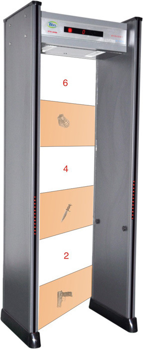 [检测精度]:安全门的灵敏度远大于相关国家标准。最高的灵敏度可以检测到一个钢质回形针,并且还可以排除皮带扣,皮鞋,胸罩等的影响,检测大型金属或受控刀和枪~~支等违禁物品。