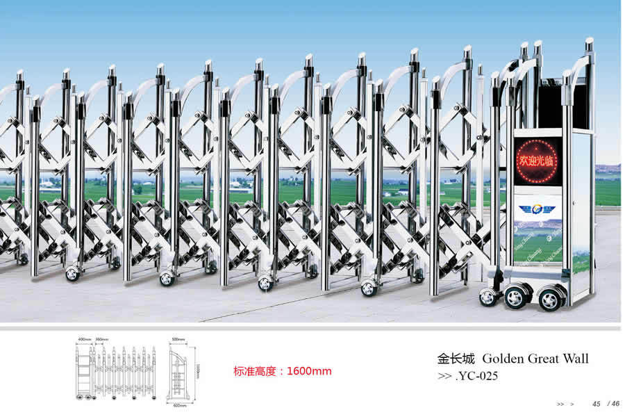 产品详情:(1)确定变速箱中控制箱的位置,即支配伸缩门开关的设备的位置;(2)将220v电源引入控制箱的下端。最好带一根厚度为1.37的接地线,并且有漏电保护装置和PVC暗荷。(3)预留¢32mmPVC管道,从控制箱位置的下端向下到地面以下,越过墙壁,直到轨道在地面以下0.1-0.15m的大体位置,以备将来用到伸缩门室外电路的入口;(4)根据上表得到门的长度。建造门时,孔宽内的空隙不小于0.75-0.8米,平常门的高度内的净尺码不小于门的高度+0.25米,豪华门不小于小于门高+0.1米;门孔内侧的顶端宽0.4米,高0.6米。如果也许,门孔的总长度可以增加0.2-0.3米,从而可以增加检查孔的长度。更换成小门,以有利于将来对伸缩门的电缆开展维护和保养;(5)在铺设跑道之前,除宽约0.8-0.9米外,在两侧打算地面;2-3天(冬天5-7天)将来,在铺设轨道时,土建工程应协调轨道上的地面。留意在铺设轨道时,不准通过道路,以免弯曲轨道。(6)安装伸缩门,联接线路,调试开关控制箱,伸缩门可分成哪些类别?按主要材质分类: