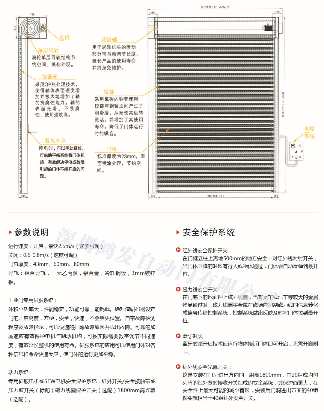 什么是涡轮硬门?这意味着门帘的提升是快速门,它以固定螺旋涡流的形式提升。快速升降门帘时,门帘与门帘之间不会产生摩擦,从而提高了快门的使用寿命。涡轮增压快门-一种集保温机能于一体的新型金属工业门,节能,密封,高效,抗风,环保。开启速度可以达到每秒2.5米。适用于频繁的高速物流通道。隔热门铝板的厚度为0.7mm,中间为聚氨酯发泡隔热门;门的总厚度为40mm,宽度为180mm,每米重量为1.36kg,具备隔热性好,重量轻,强度高,抗冲击等特征,抗风等级≤12且抗防盗。该门适用于室内外物流和生产的快速通道。这种门的使用可为企业节约大量由于空气循环而导致的能量损失,与一般而言工业滑门相比之下可节省能源约80%这种门类型的快速开合大大提高了企业在生产和物流中的转移速度。门是企业物流和生产的必需通道。其采用和选取直接联系到企业生产和物流的效率。该产品具备可靠性高,实用性强,操作简易,维修快速的特色。驱动控制使用平稳,节能,确切的硬快门系统,以确保产品的安全性。门体的可靠运行,确保每年展开15万次以上的无故障操作。