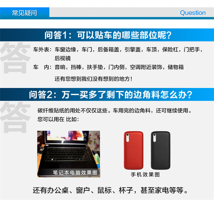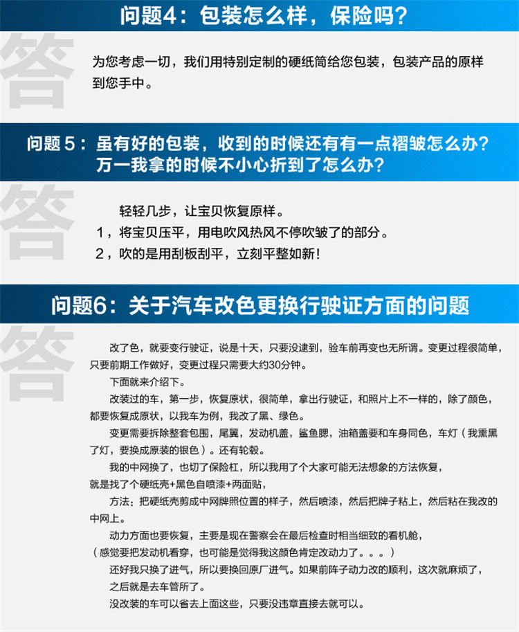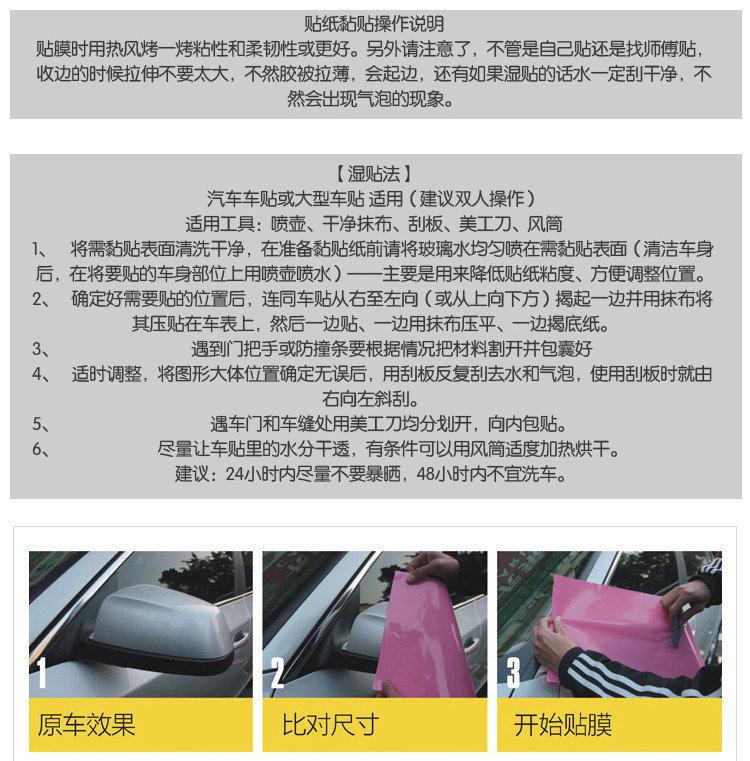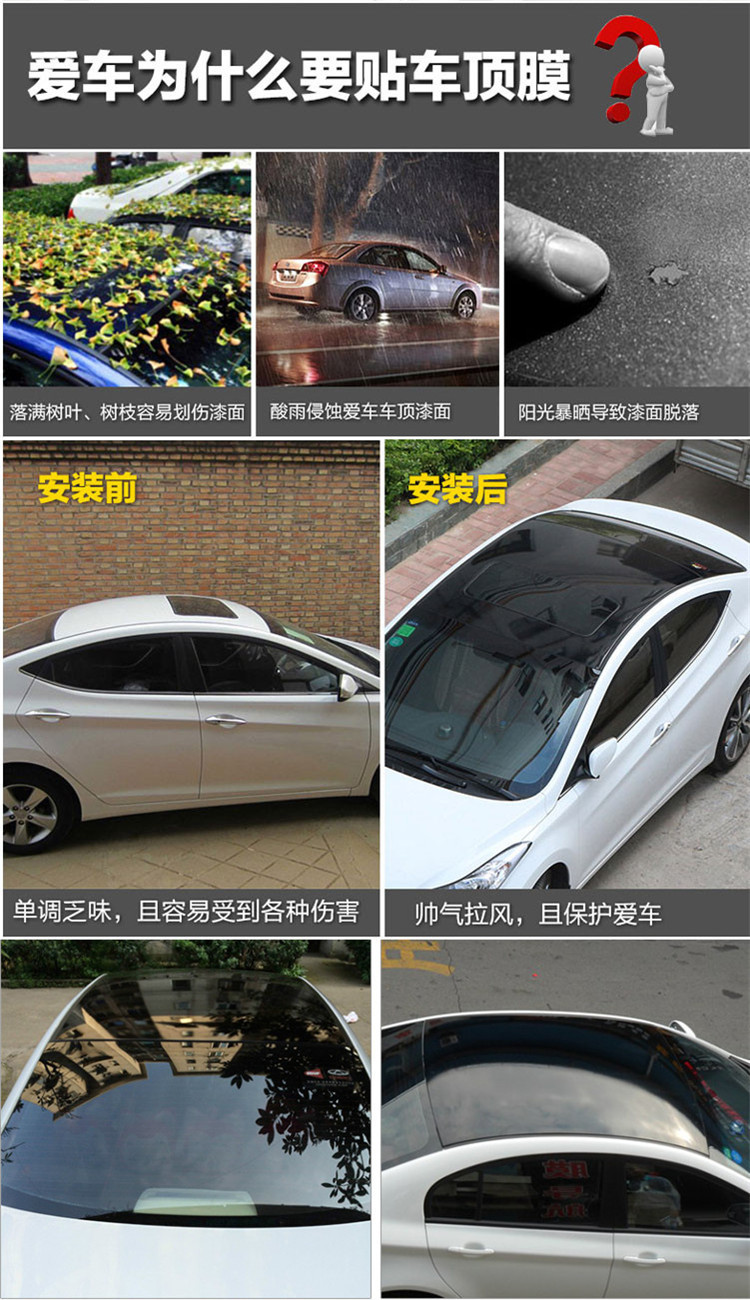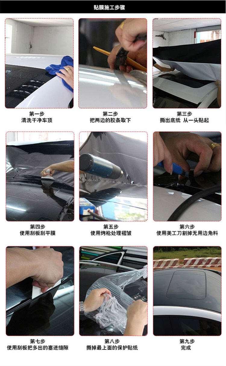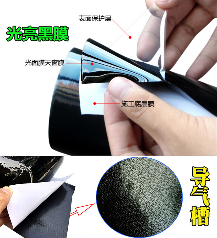 该材质是防水,防晒,耐高温的,合适贴在汽车的引擎盖和车顶上。它用以变更颜色,尤为是在汽车的车顶上。它兼具长距离全景天窗的功用。粘贴时最好使用牛津scraper。请勿使用硬刮板,如果使用硬刮板,则可以用一层布匹包裹刮板。该产品有通风槽,可以干燥。