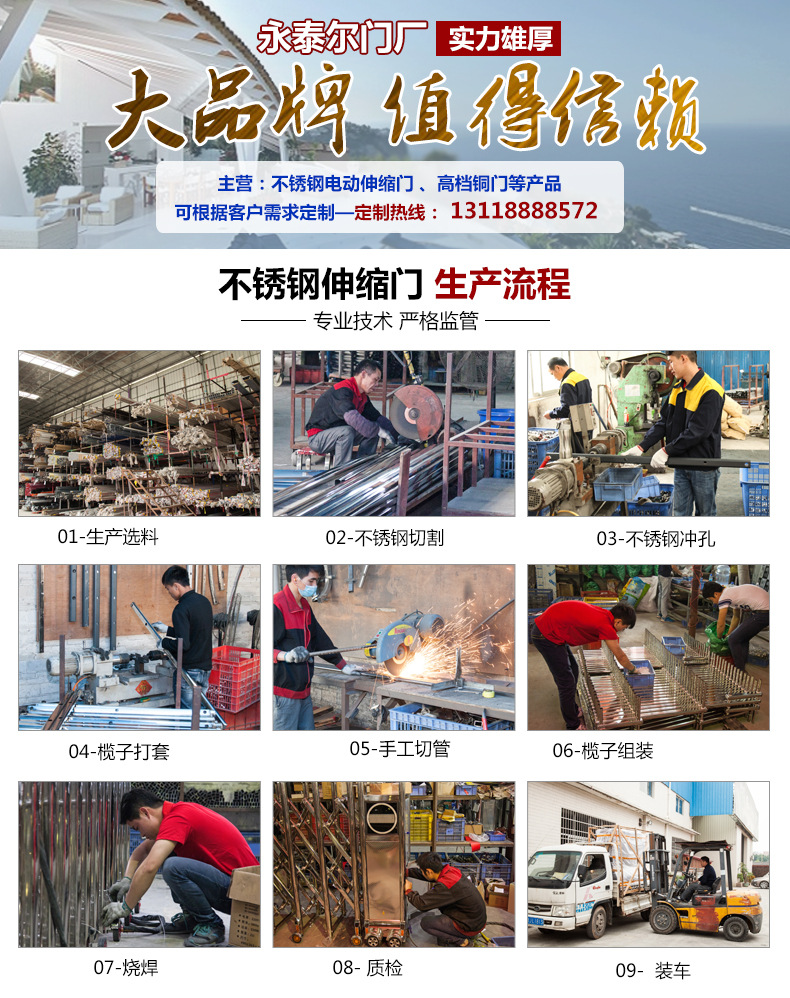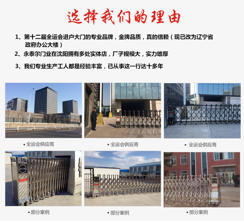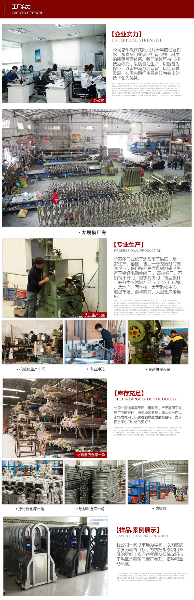 永泰尔门业���于沈阳市于洪区,是一家提供生产,销售和售后服务的一站式服务的独资企业。它用到多种优质材质开发和生产不锈钢电动伸缩门,优质不锈钢门,不锈钢平开门和楼宇对讲门。,圆锥形旗杆,防护窗,推拉门等不锈钢产品,可普遍用以酒吧,房地产,写字楼,大型商场,杂货店,奢侈品商家,大型库房等处所。公司总部在沈阳,经过数十年的业务积累,永泰尔门业业已享有完整,科学的质量管理体系。我们一直坚称:仰赖科技,以质量为生命,以服务为保证,以客户令人满意为宗旨,创新发展,在国内同行业中具较为突出的技术领先优势。在当今猛烈的市场竞争中,我们继续本着诚实,务实,创新的经营理念不停健全自己,为用户提供更完善的产品和服务。人性化管理是我们公司站在行业的最前沿。公司始终追求高品质,专注于服务。其产品获得了客户的普遍赞誉,并受客户的喜爱。我公司始终以市场为导向,以客户令人满意为最后目标,奋斗使永泰尔门业变得更好。欢迎各界朋友光临沈阳市于洪区永泰尔门窗厂,指导和接洽业务。