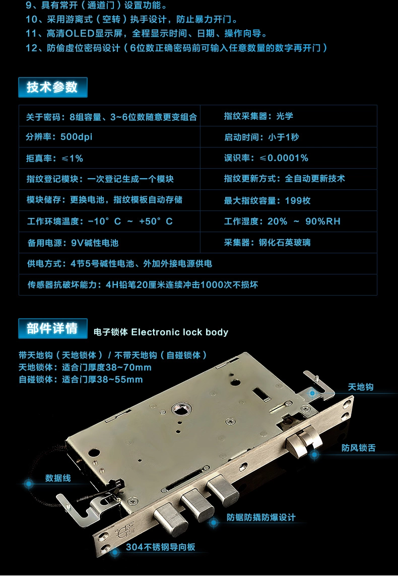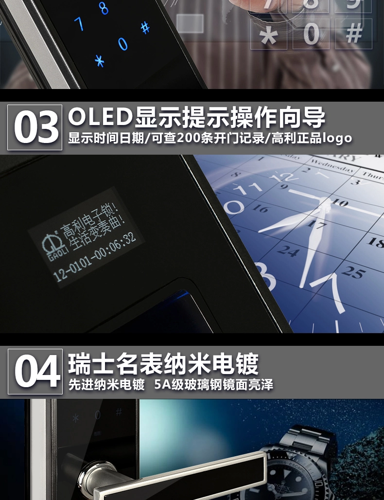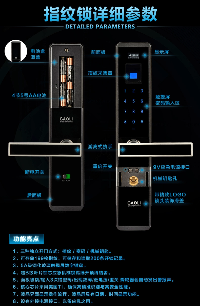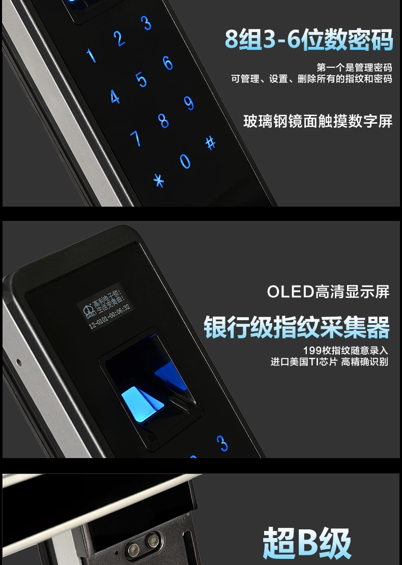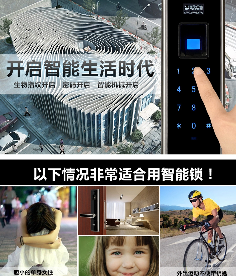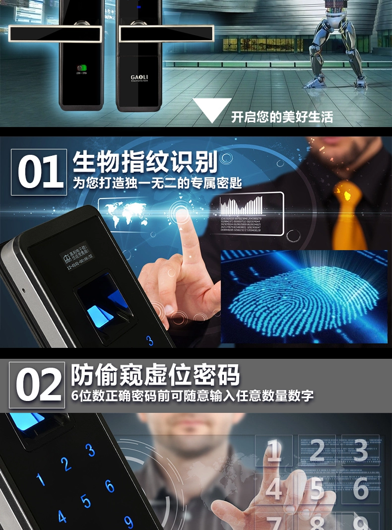 4.三种单独的开门方法:指纹+密码+机器钥匙。