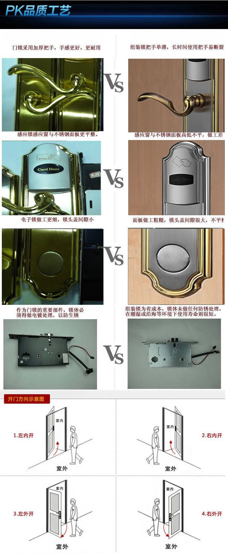 答:首先,酒店锁的组成:锁体,锁头(带钥匙),主板,两个前后面板以及一些固定配件。可以看出,影响锁稳定性的唯一因素是锁体和主板,锁体是操纵整个锁的开关是否正常工作的基本。如果锁体太差,则无法通过刷卡敞开门,并且锁舌不灵巧。主板是决定卡的灵敏度和响应速度的基本,它还决定着门的位置。锁定失败率。作为服务行业,如果一天的业务由于故障而延期,则将费用数千美元;其次,客户体验是第一个。频繁时有发生故障会巨大地下降客户的使用舒适度,因此在选择此类电子锁时需十分小心翼翼。