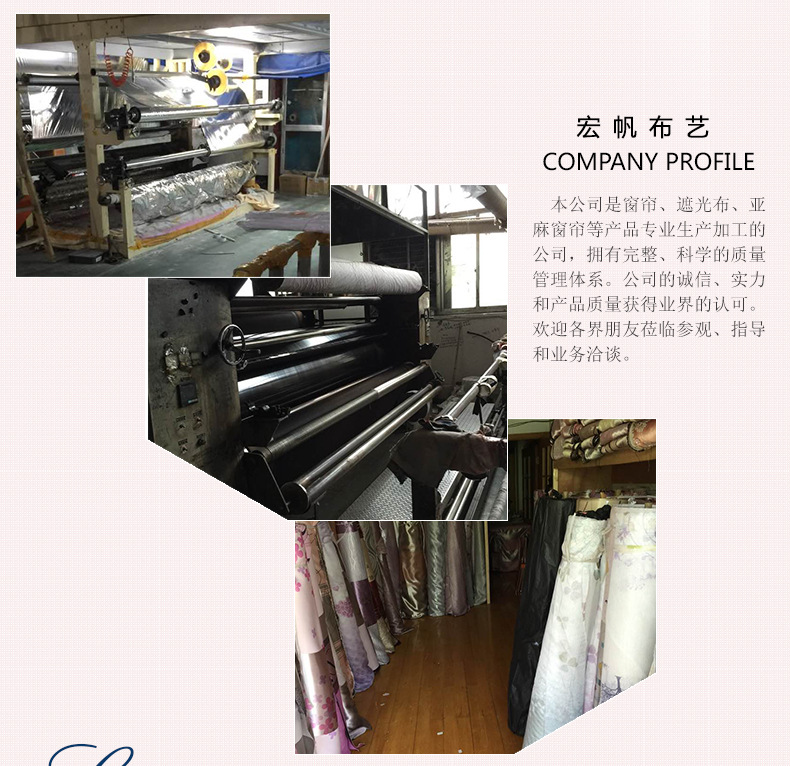 宏帆布艺是一家专业生产,加工窗帘,衣料等产品的公司,持有完整科学的质量管理体系,公司的诚信,实力和产品质量获得了业界的认可,欢迎各界朋友参观,指导和洽商业务的生活