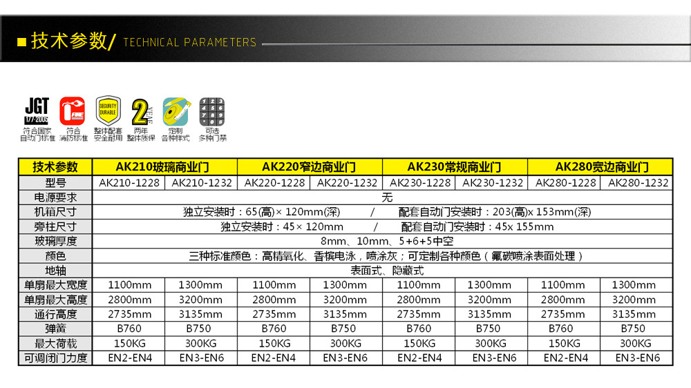 技术参数AK210玻璃商业门AK220瘦边商业门AK230许边商业门AK280广边商业门