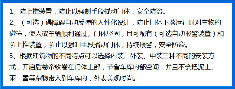快速,安全,无噪声,防尘,防止室外空气对流,改善车间环境和卫生,并具有较长的使用寿命。