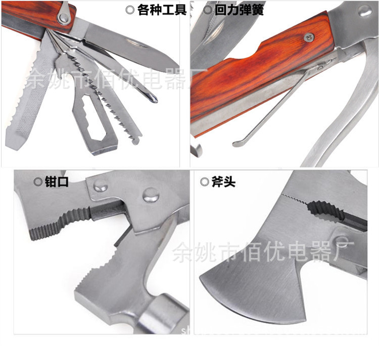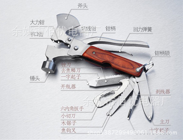 [主要工具]老虎钳,剪线钳,锤子,刀,十字螺丝刀,锯,锯齿刀,一字螺丝刀,锉刀,开瓶器等机能合而为一。
