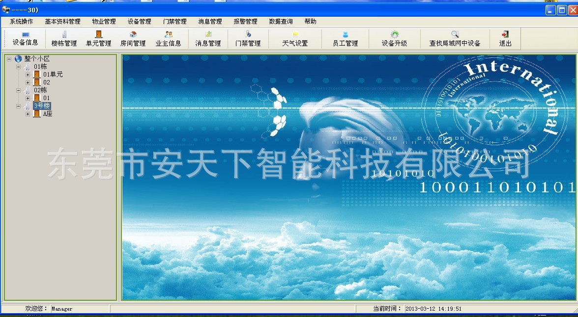 安天下数字对讲管理中心由计算机和对讲机管理软件组成。所有功能都集成在软件界面中,可以在计算机上直接完成设备设置,IP地址规划,屋子号设置,信息发布,警报管理和其他相关操作。1.适用于Windows2000,WindowsNT,WindowsXP,Windows2003和其他操作系统;2.支持紧急呼叫和报警信号接收;3.系统管理用户功能系统分成管理员用户和操作员用户。种类。4.信息发布功能。信息发布方法分成“点播”和“广播”两种。5.地址管理功能6.电子地形图功能7.通话监控功能8.报告信息;9.家庭信息管理功能10.呼叫记录11.系统日志。