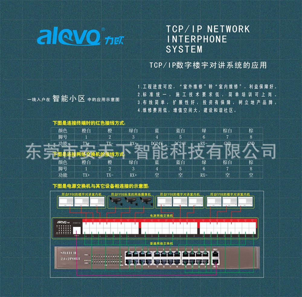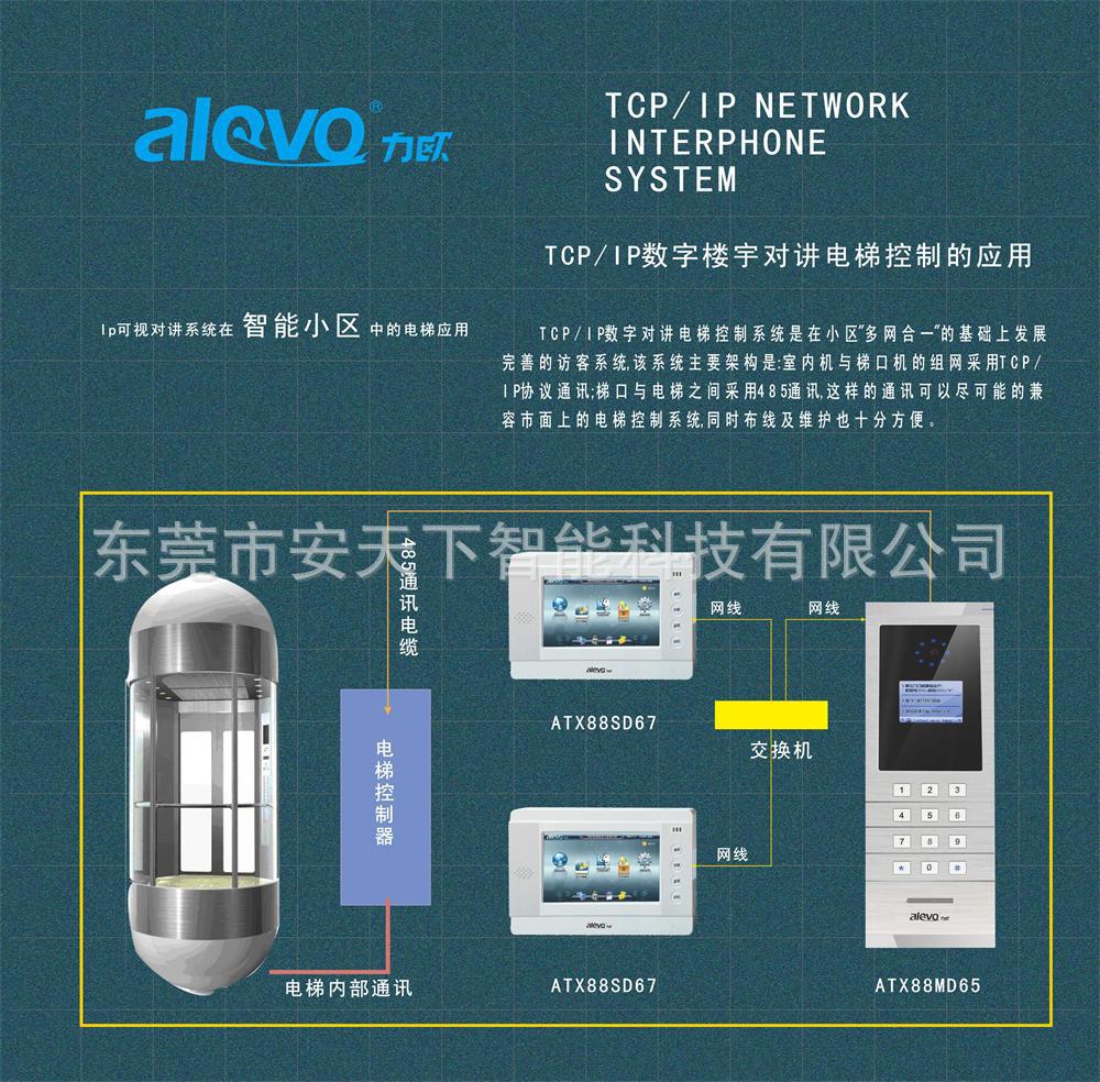 东莞市安天下智能科技有限公司是一家大型高科技公司,致力于TCP/ip纯数字产品的研发。公司施行“力欧”品牌战略性,alevo的产品数字对讲,车管理,电梯门禁,智能家居,背景音乐,网络监控,网络门禁等组成“多网”一体化”体系,质量保证,守信,欢迎定购。