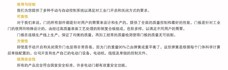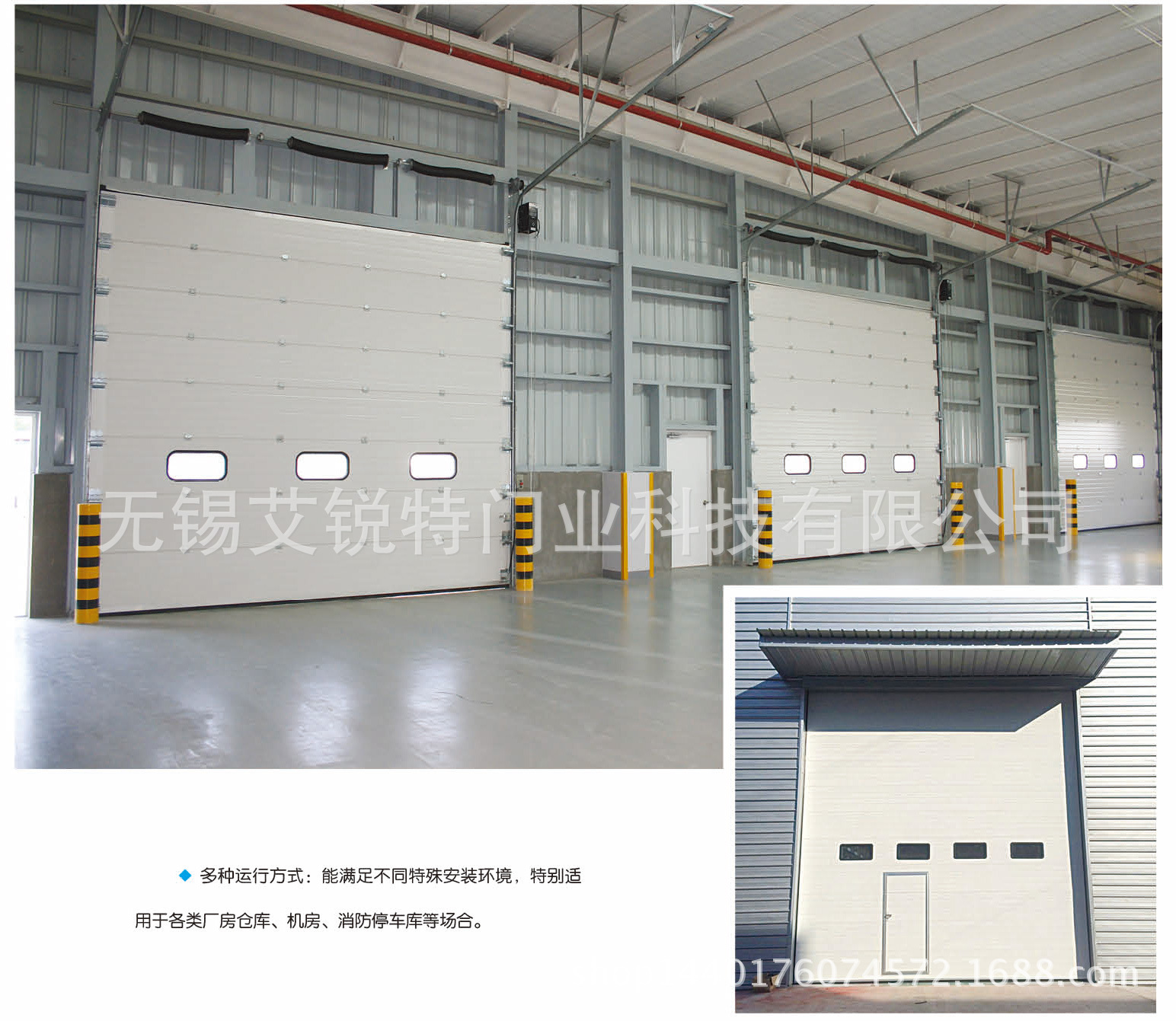 产品详情:无锡艾锐特门业科技有限公司是一家集设计,研发,生产,销售和服务于一体的综合性企业。其产品包含住宅,工业和商贸等各个领域的电动和自动门窗。主要产品包括型材卷门抗风门,防火卷帘门,车库翻板门,硬质快速门,快速软帘门,堆积门,透视门,工业滑门,工业平开门,网状门,接连门,新的消声门,电动伸缩门,汽车止动器,停车系统,护栏,护栏和其他产品已以其完整的系列,理想的构造和上佳的设计在全国范围内获取普遍好评。
