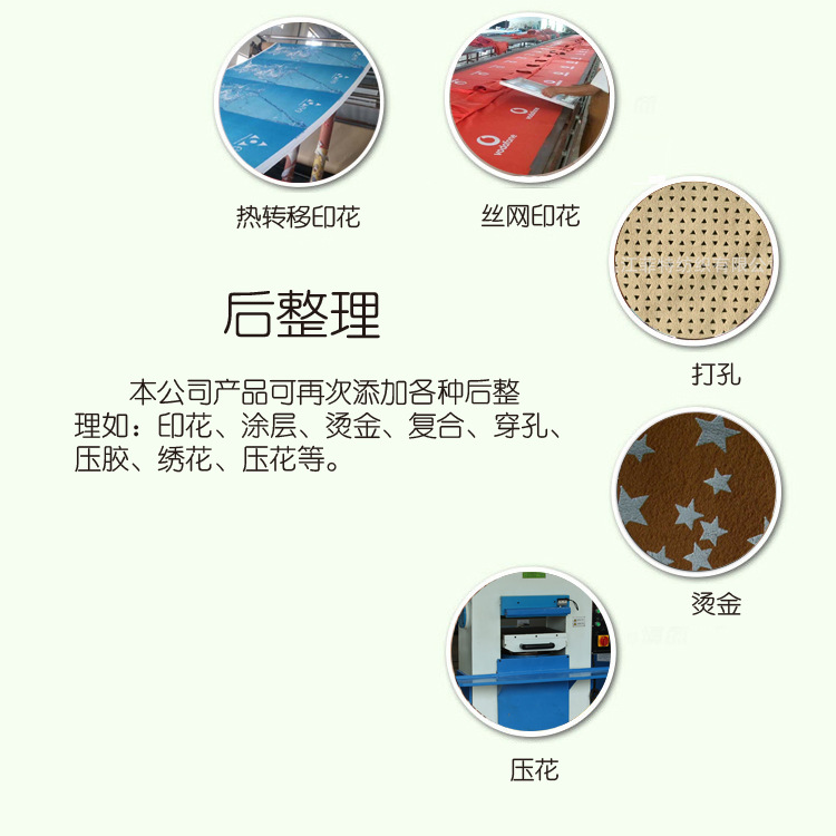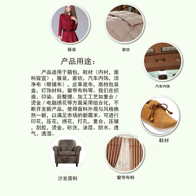 105D*150D,200D,300D和其他翘曲绒面革;75D*225D五,六和其他纬绒面革;7S,10S和其他绒面革;双面绒面革;粗斜纹,细斜纹和其他斜纹绒面革;树皮绒面革绣花,印刷,烫金,压花等绒面革;人字斜麂皮绒;宽经纬绒面革皮革天鹅绒