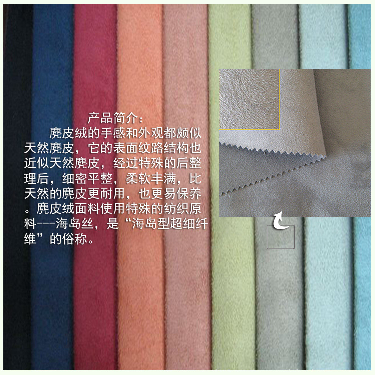 绒面织物用进口的海岛纤维细密地编织而成。经过染色和各种整理后,具柔软的手感和美妙大方的毛发感觉到。适用于制造沙发,靠垫,窗帘,衣服,鞋类和床上用品;