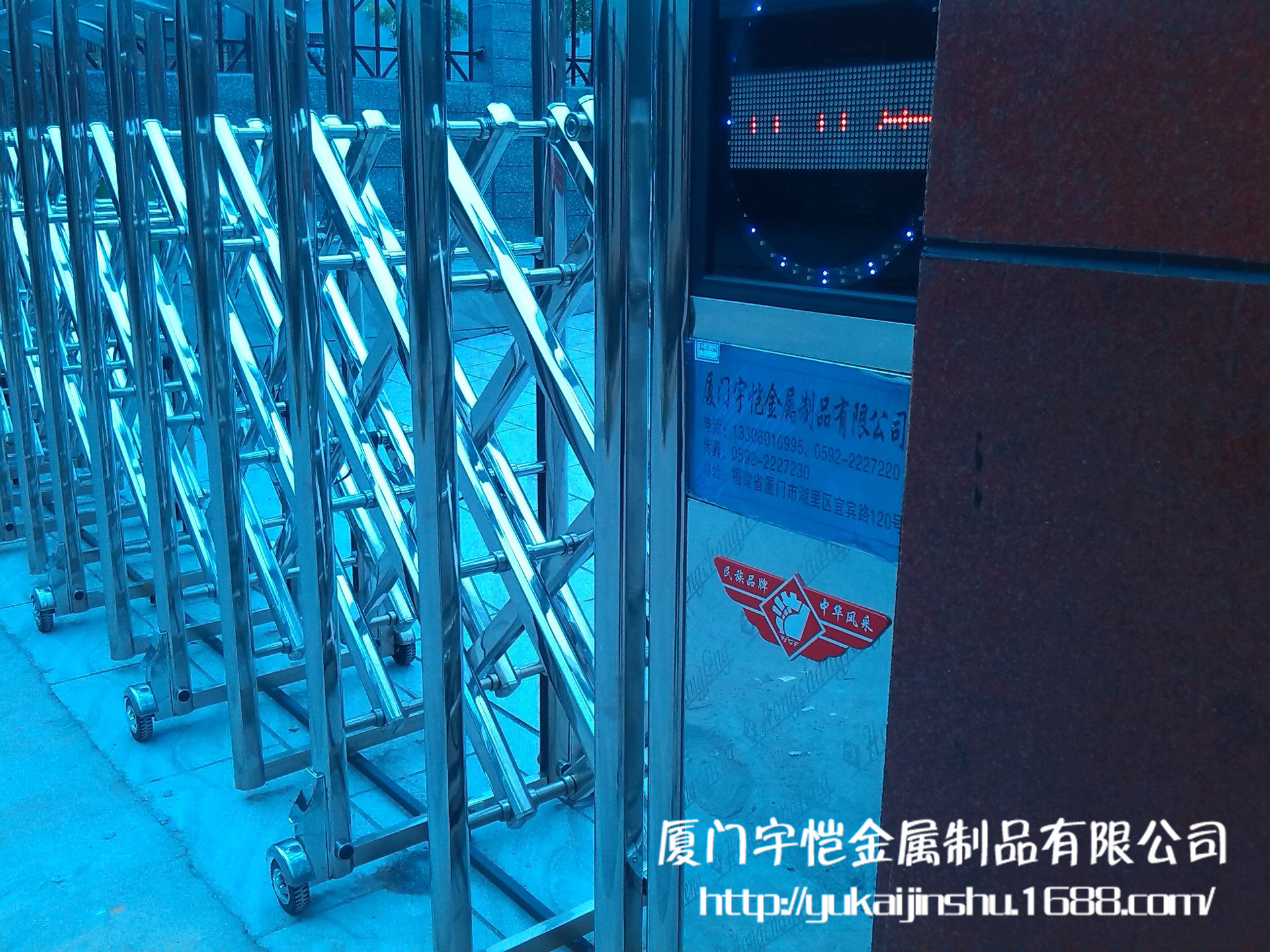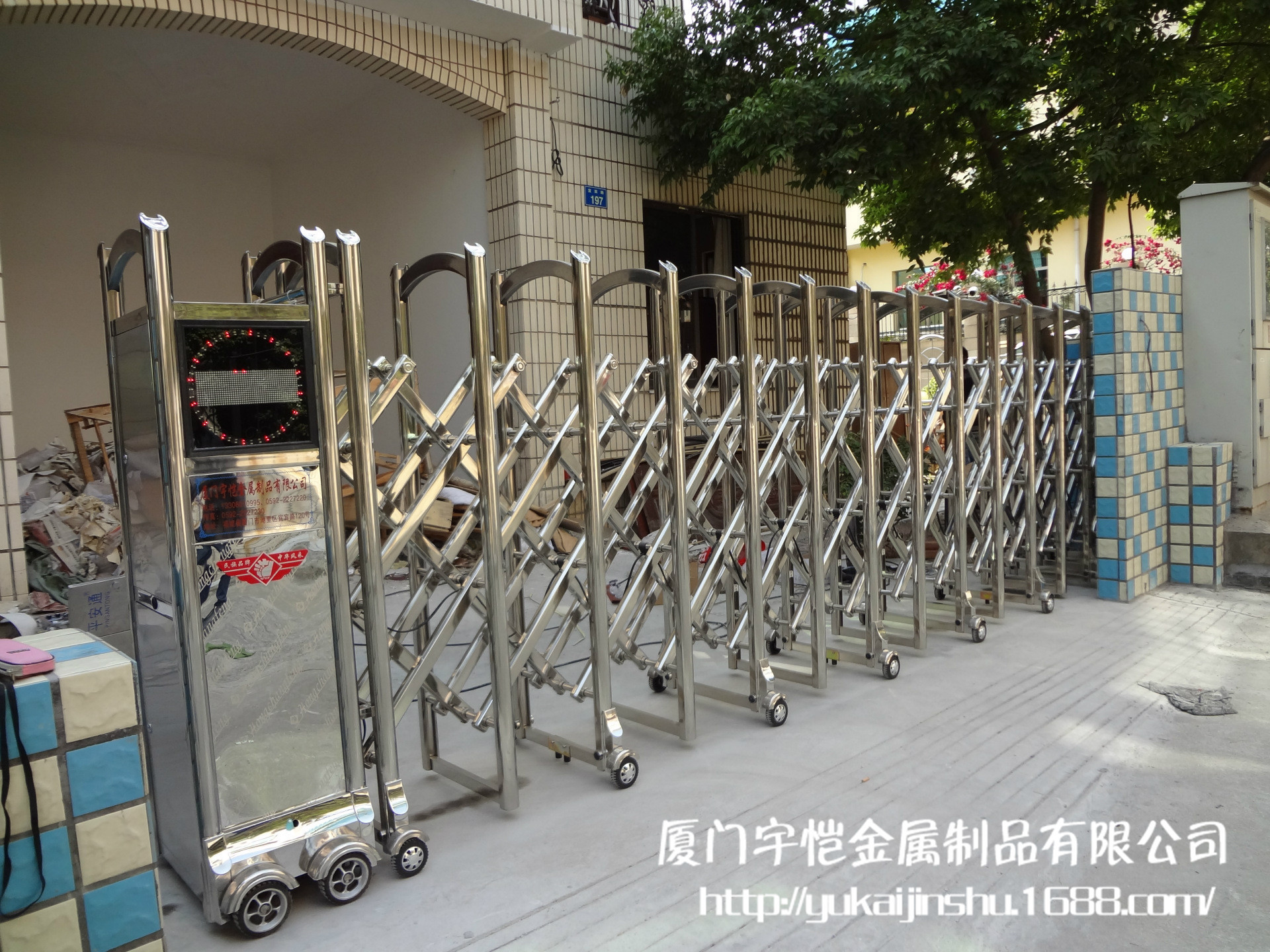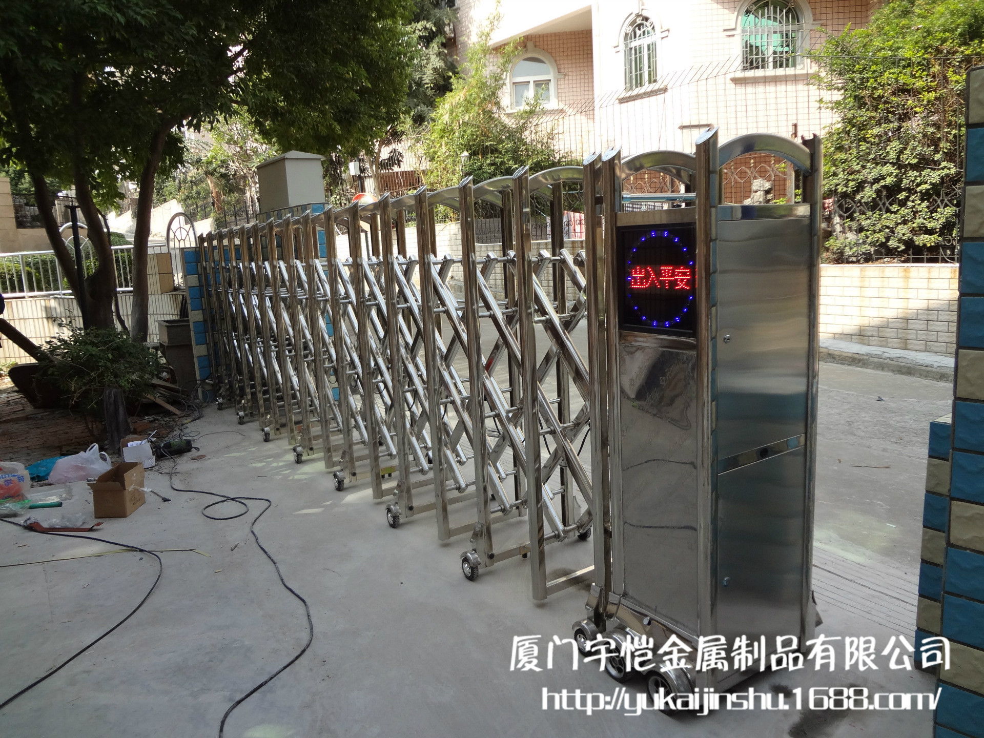不锈钢伸缩门系列:门体由纯不锈钢制成,有着很高的硬度和亮度。构造设计合理。门体运行稳定,抗风能力强。交叉连杆上刻有高精度冲头,孔内加不锈钢管使耐磨性更强,无刺耳的摩擦声,大大延长了门体的使用寿命。