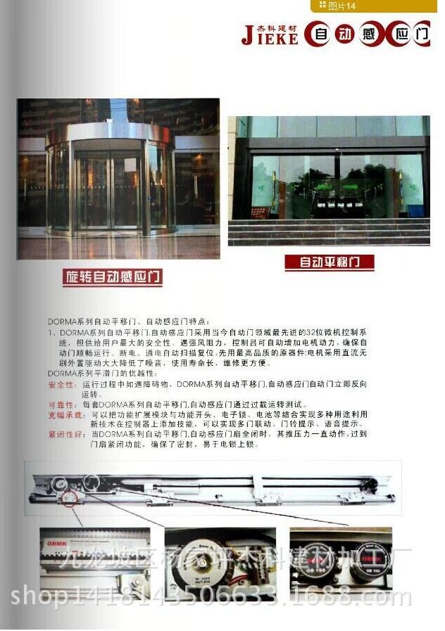 产品详情:自动感应门包括:电机,轨道,钢化玻璃,木质基层,不锈钢门框,此类产品是全然定制的,实际的单价取决于门的尺寸。