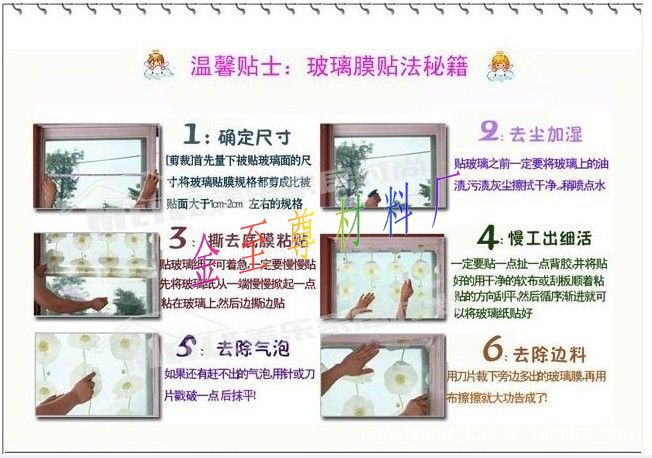 留意:有些朋友说,他们顾虑粘贴后不会被剥落。然后,请在贴有玻璃贴纸的地方用热水(30-40度)加热或用吹风机吹干。也有胶水(可以用到热水,乙醇,汽油,煤油),只需用^-^擦拭即可清洁这些东西。