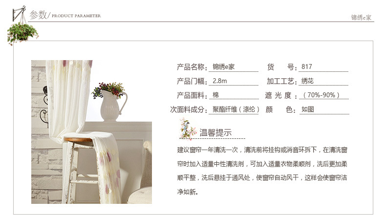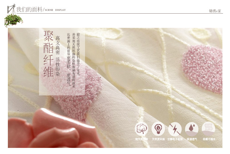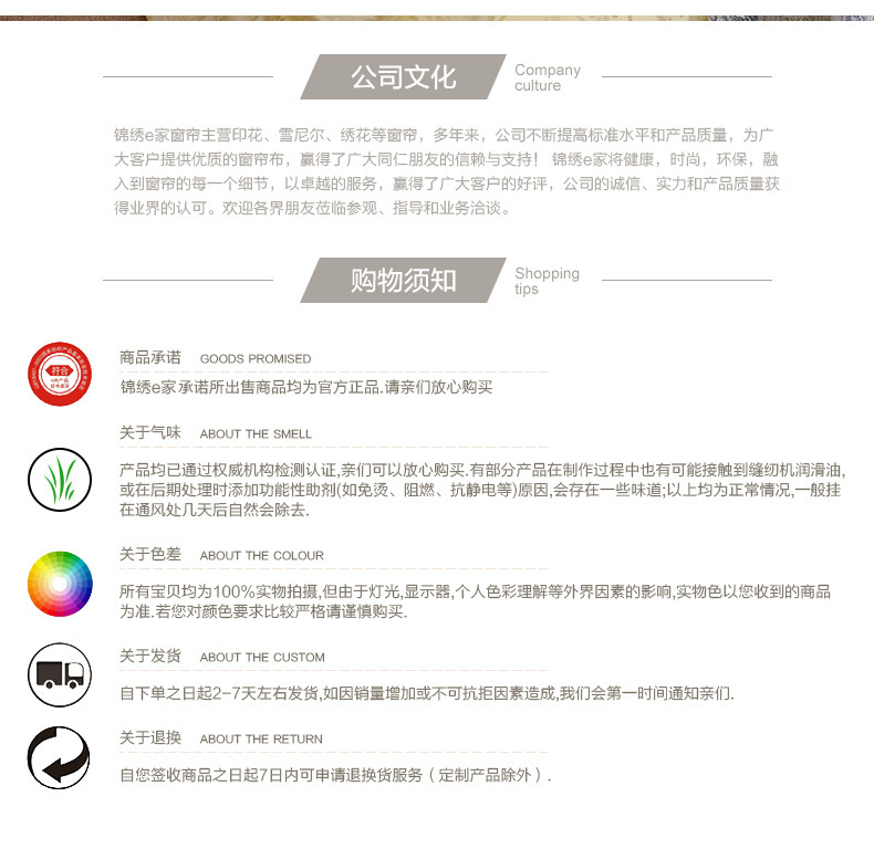 锦绣e家窗帘主要从事印刷,雪尼尔,绣花和其他窗帘。多年来,公司不停提高基准和产品质量,为客户提供优质的窗帘布料,并赢得了同行和朋友的信赖和支持。窗帘。凭借优质的服务,赢得了客户的好评。公司的诚信,实力和产品质量获得了业界的认可。欢迎各界朋友光临,指导和接洽业务。