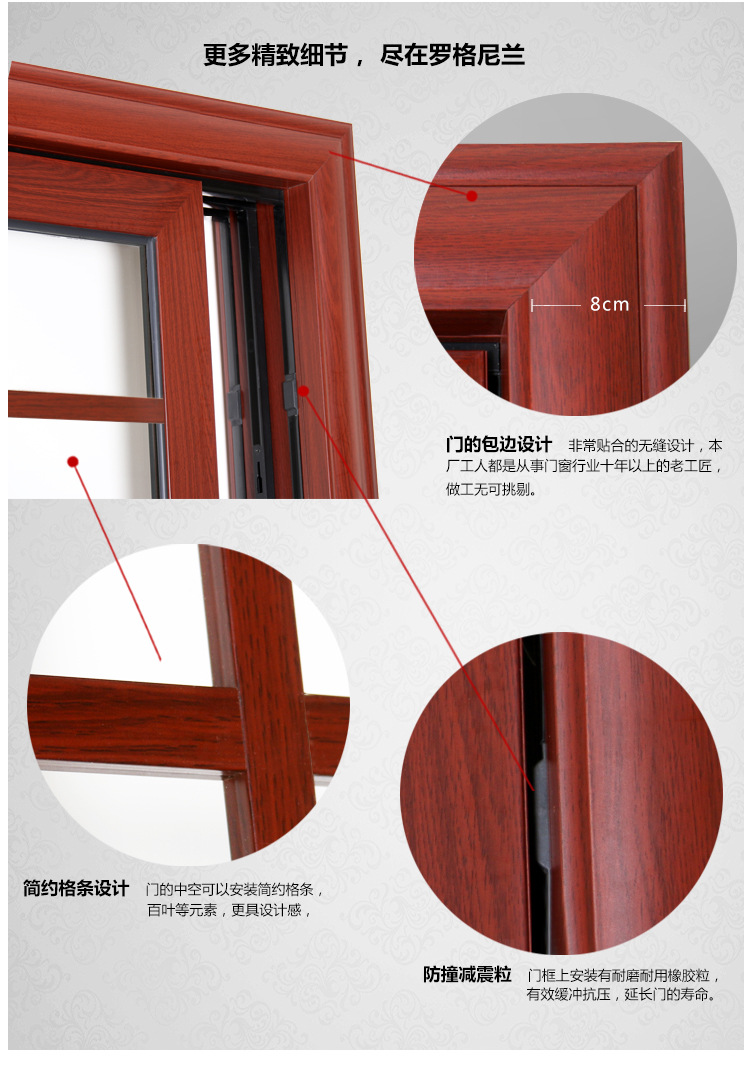 罗格尼兰引进了德国门窗系统的先进技术和装置,与德国RAMS设计师的技术合作,仔细的设计,严格的材质选择,标准的生产,并制造了适合不同空间和建筑风格的各种式样要求。多功能和智能门窗产品。该产品使用德国hardware配件和型材的组合,使产品使用更安全,更美观,更多样化,更耐腐蚀,还为您的屋子空间带来更真实的美感。