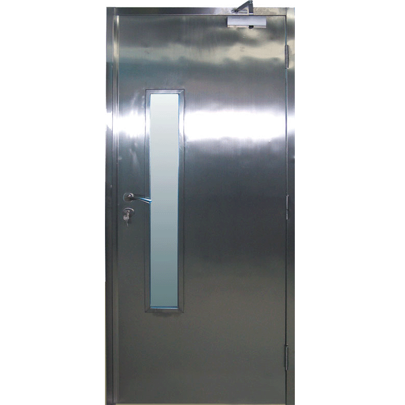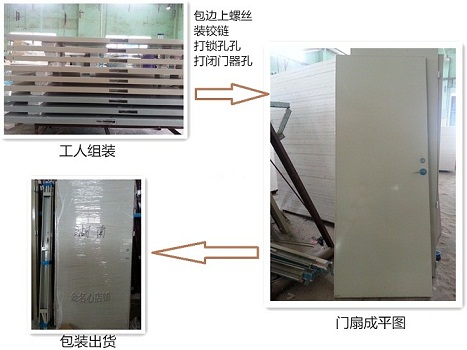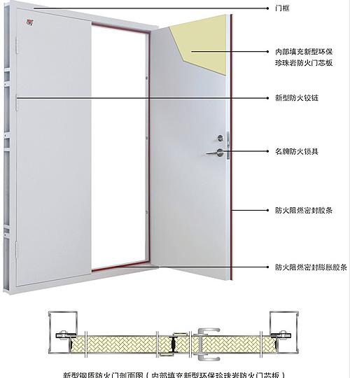 门框(材料厚度δ=1.2mm)和门扇面板(材料厚度δ=0.8mm)均使用进口或国产高质量冷轧钢板,电镀锌钢板或不锈钢板制造,门扇为门框内部填充有新型的防火和隔热材料(珍珠岩板),水泥砂浆填充了水泥浆,这不仅保证了门框与墙壁之间的连接以及门与墙之间的连接强度。门铰链和门框,还满足门框的耐火和隔热性能。