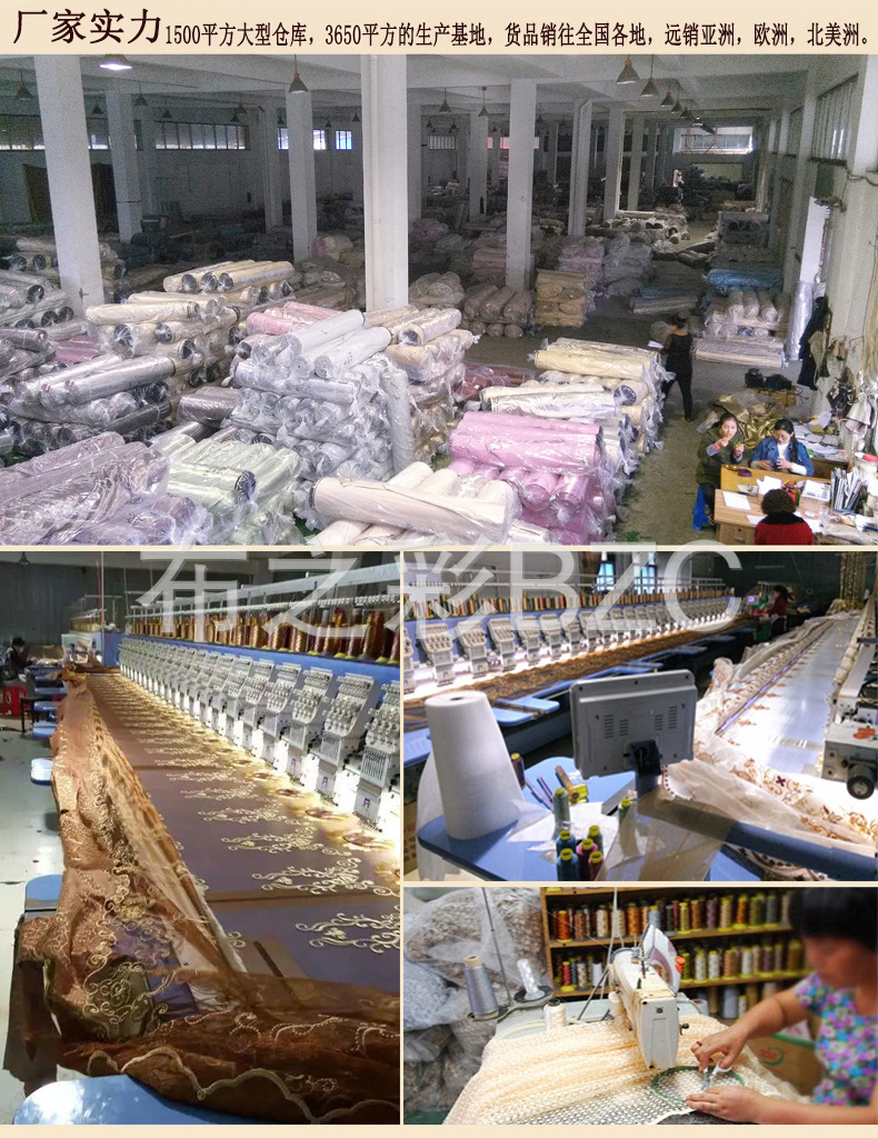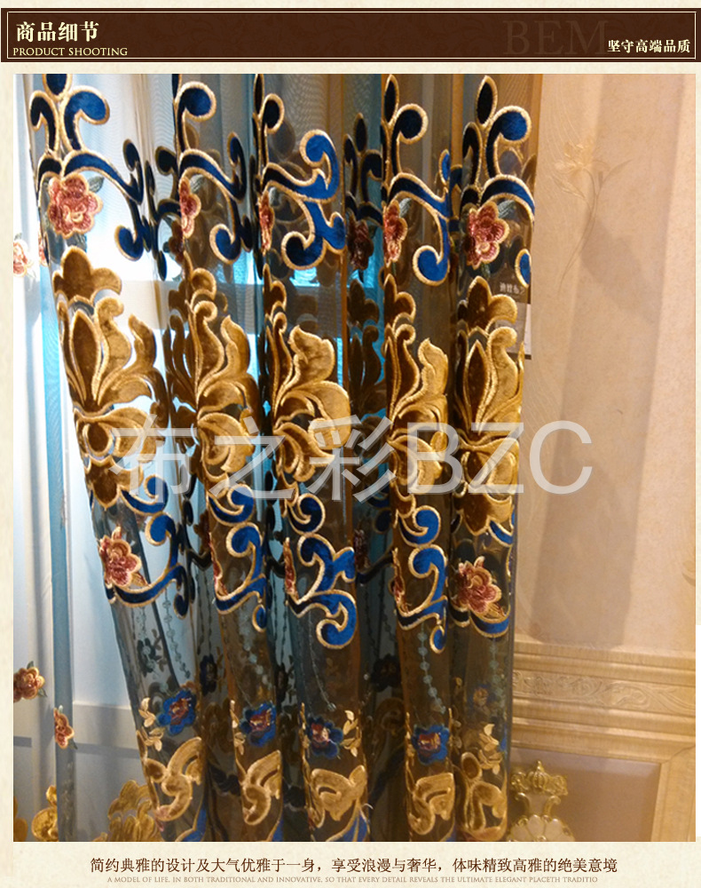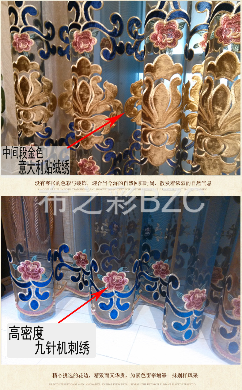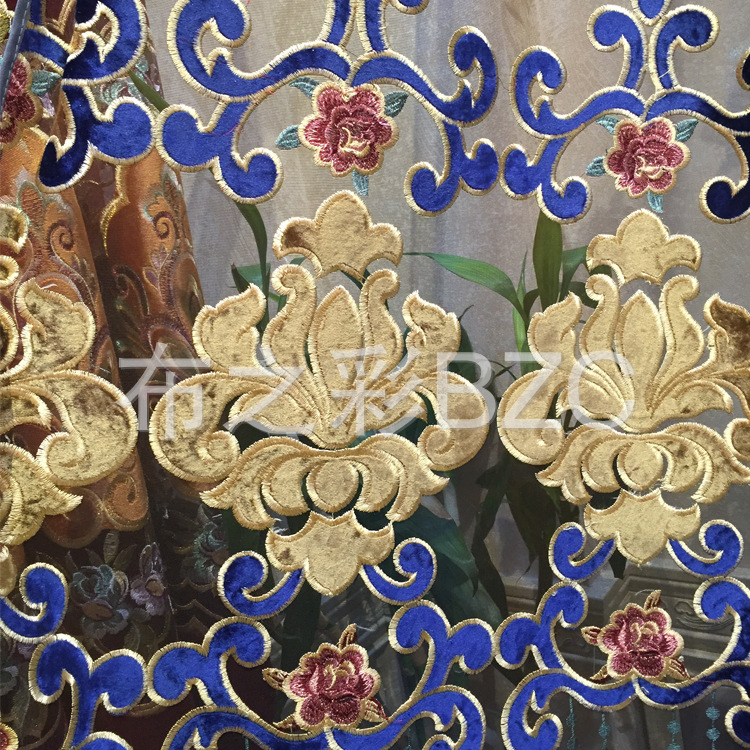 高端奢侈意大利贴天鹅绒绣花线,高密度九针机激光绣花,欧美式雅致图案,中段金黄色贴花天鹅绒花,深蓝色蕾丝,底纱为深蓝咖渐变色,色调绚丽,色调闪闪发光,所有搭配都是独一无二的,彰显房东的尊严和时尚!