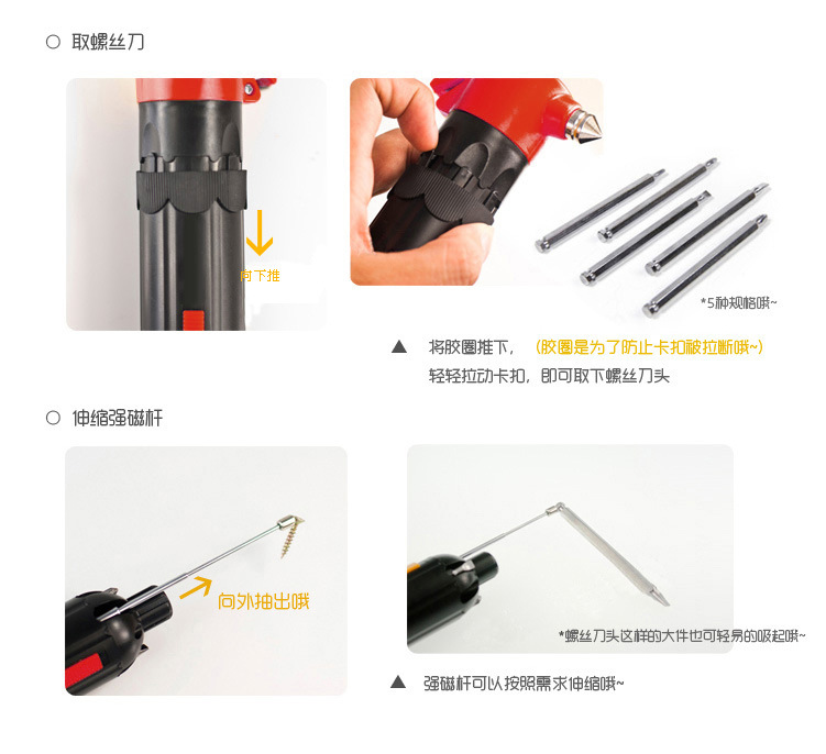 5.伸缩式强力磁吸杆的尾端可以吸起不易捡起的跌落的螺丝。